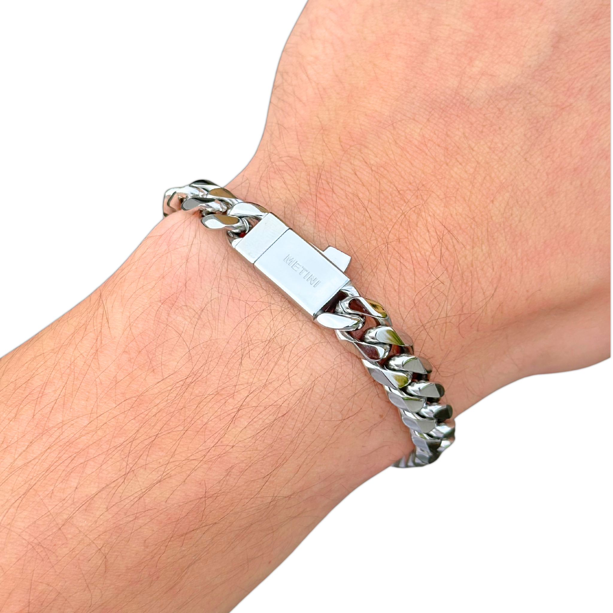 Imponująca bransoletka o splocie Cuban (10 mm) w kolorze białego złota to połączenie masywnej formy, elegancji i luksusu w najlepszym wydaniu. Charakterystyczny, gęsty splot Cuban symbolizuje siłę, niezależność i pewność siebie, a jego lśniące, chłodne wykończenie nadaje biżuterii prestiżowy, nowoczesny wygląd.