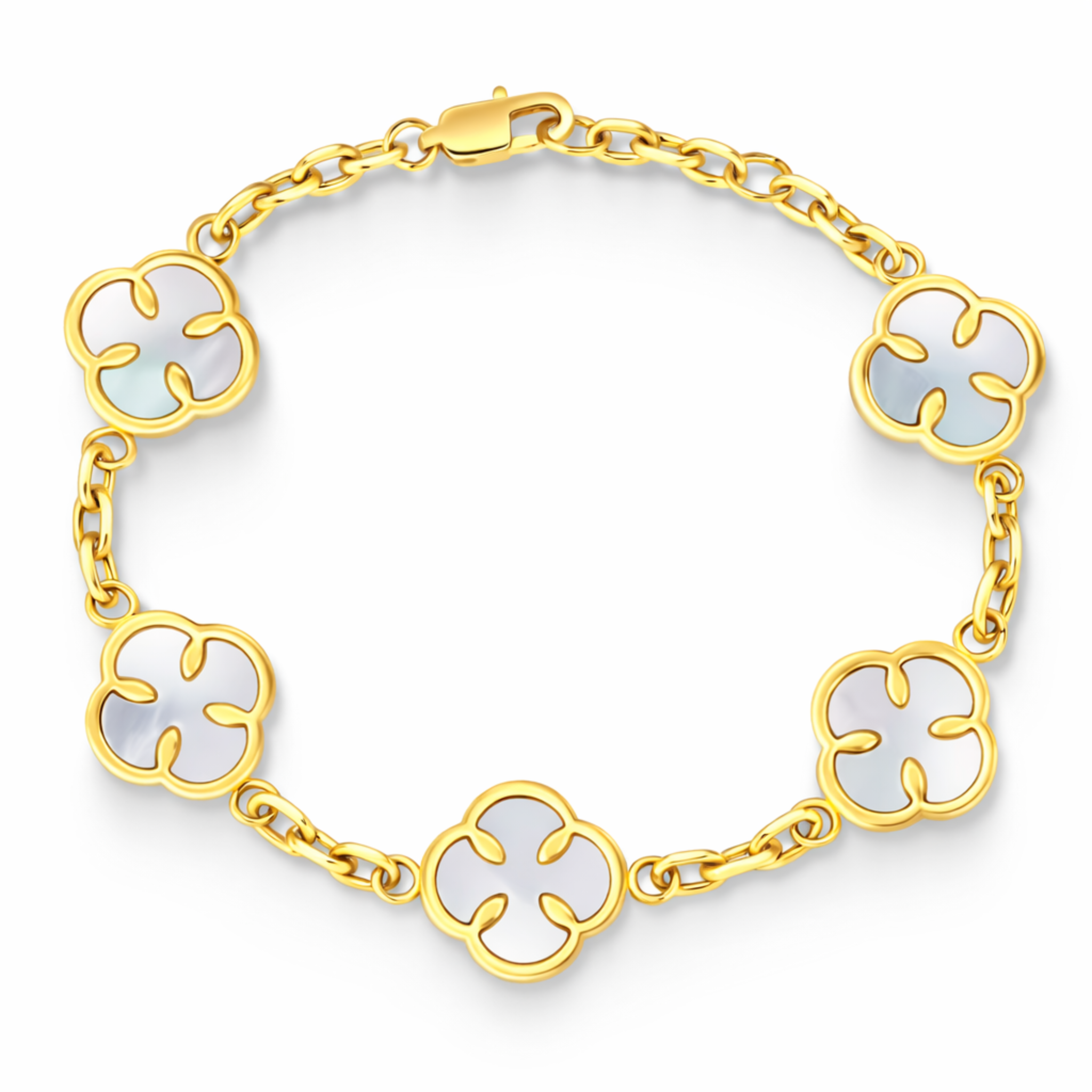 Bransoletka Koniczyna to połączenie delikatnej formy, nowoczesnej elegancji i symbolicznego znaczenia. Jej głównym motywem są subtelne elementy w kształcie czterolistnej koniczyny w bieli, symbolizujące szczęście, harmonię i pozytywną energię. Każdy z nich osadzony jest w złotej oprawie, który pięknie dopełnia biały mieniący się kolor.