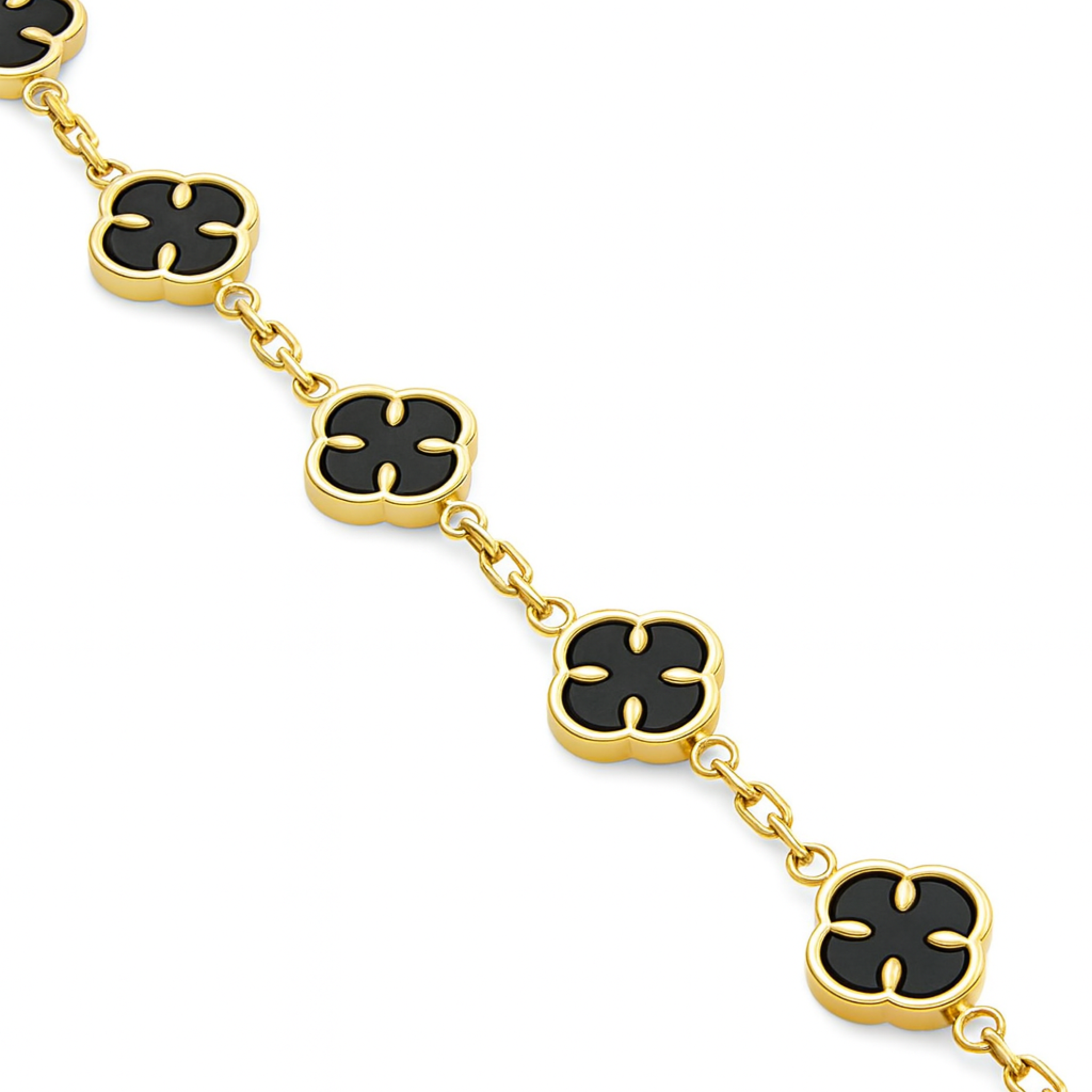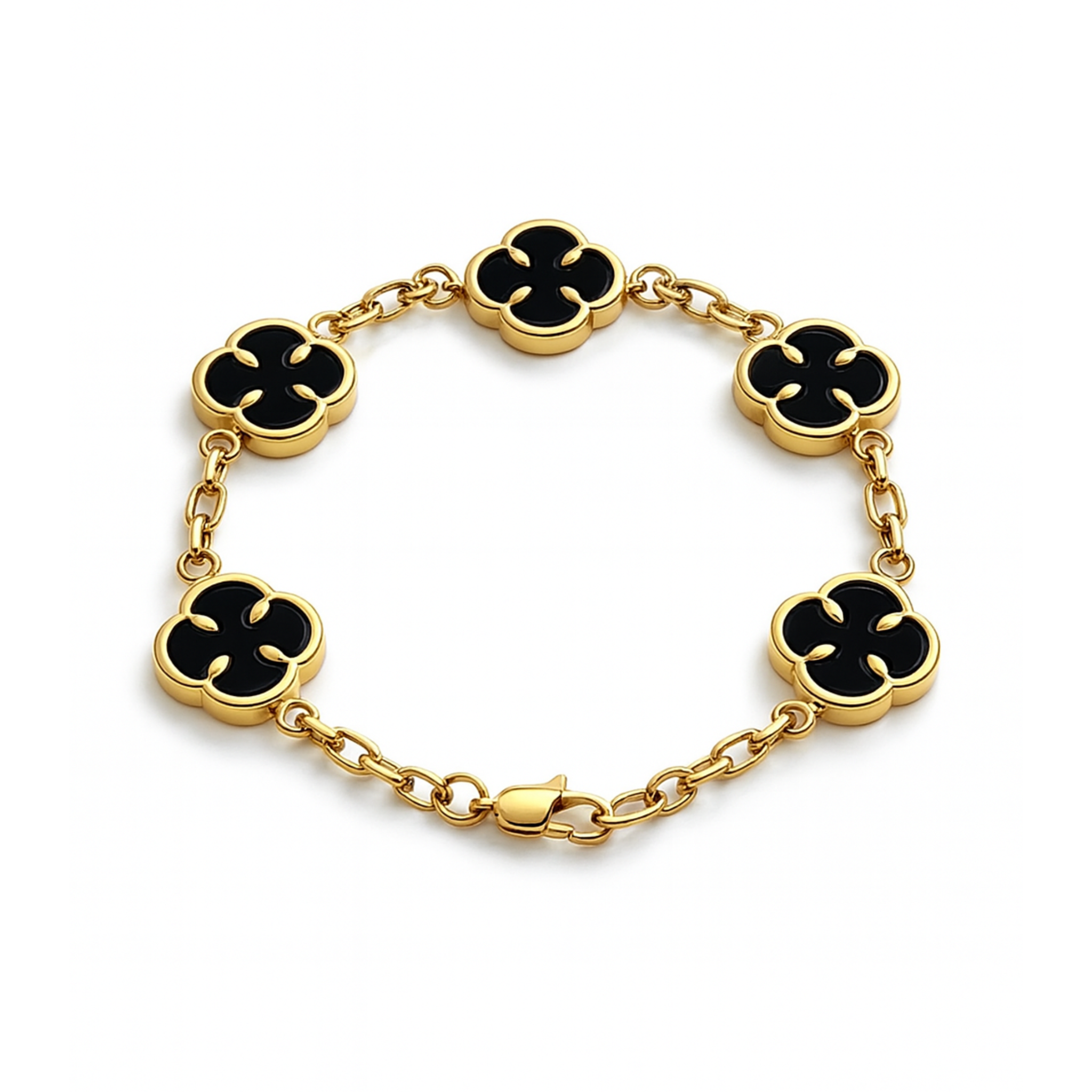 Bransoletka Koniczyna to połączenie delikatnej formy, nowoczesnej elegancji i symbolicznego znaczenia. Jej głównym motywem są subtelne elementy w kształcie czterolistnej koniczyny w czerni, symbolizujące szczęście, harmonię i pozytywną energię. Każdy z nich osadzony jest w złotej oprawie, której blask pięknie kontrastuje z głębią czarnego koloru.