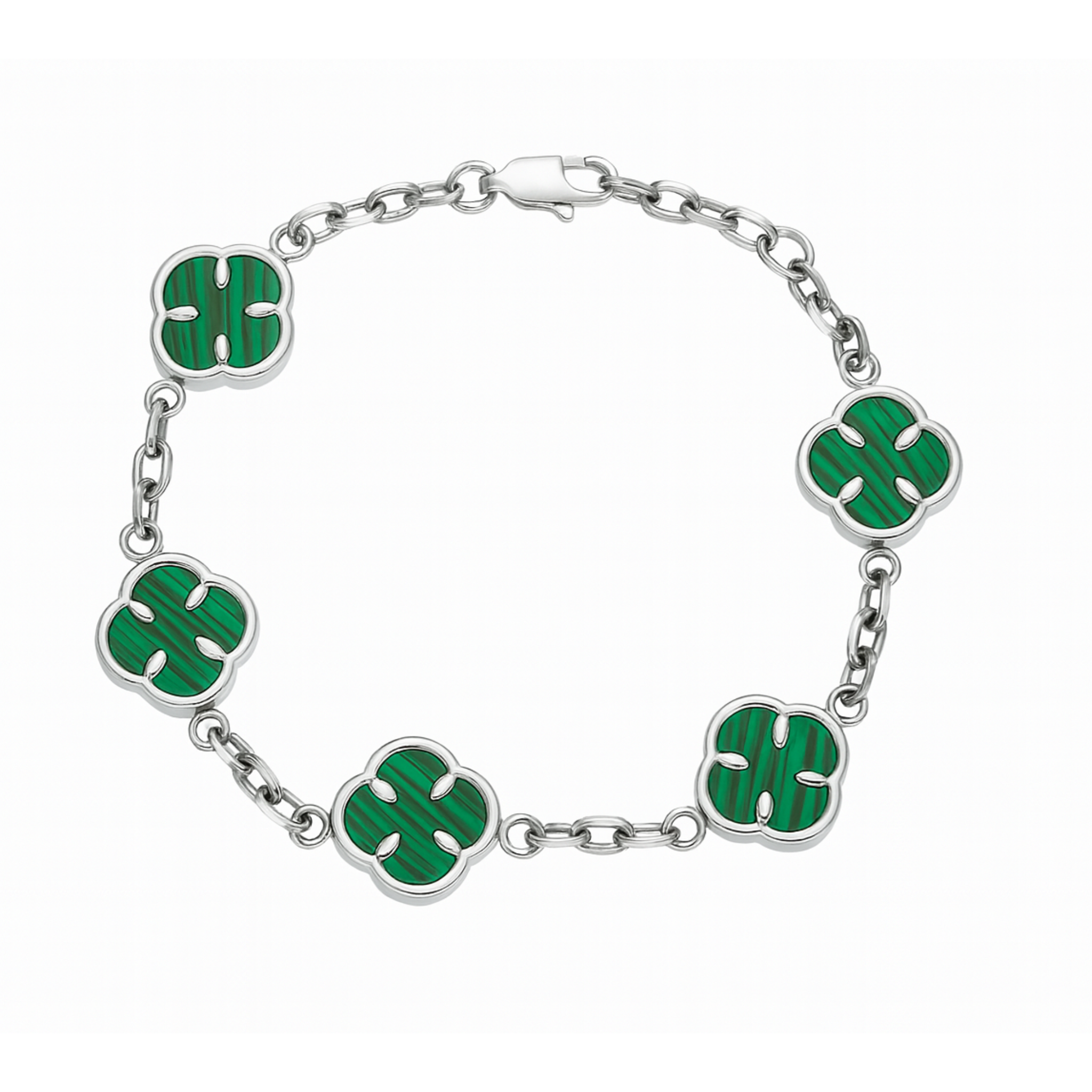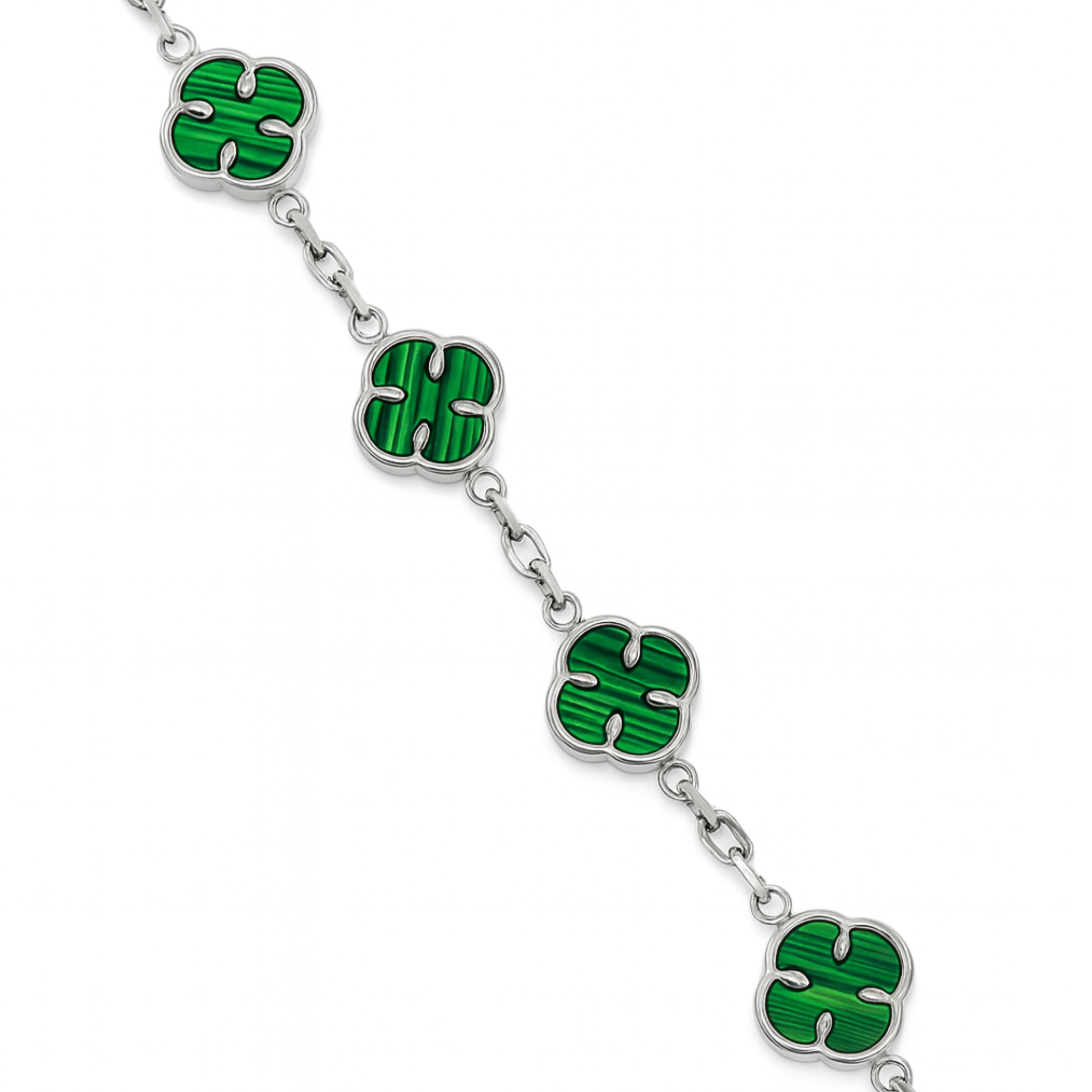 Bransoletka Koniczyna to połączenie delikatnej formy, nowoczesnej elegancji i symbolicznego znaczenia. Jej głównym motywem są subtelne elementy w kształcie czterolistnej koniczyny w odcieniach zieleni, symbolizujące szczęście, harmonię i pozytywną energię. Każdy z nich osadzony jest w srebrzystej oprawie, której chłodny blask pięknie kontrastuje z głębią zielonego koloru.