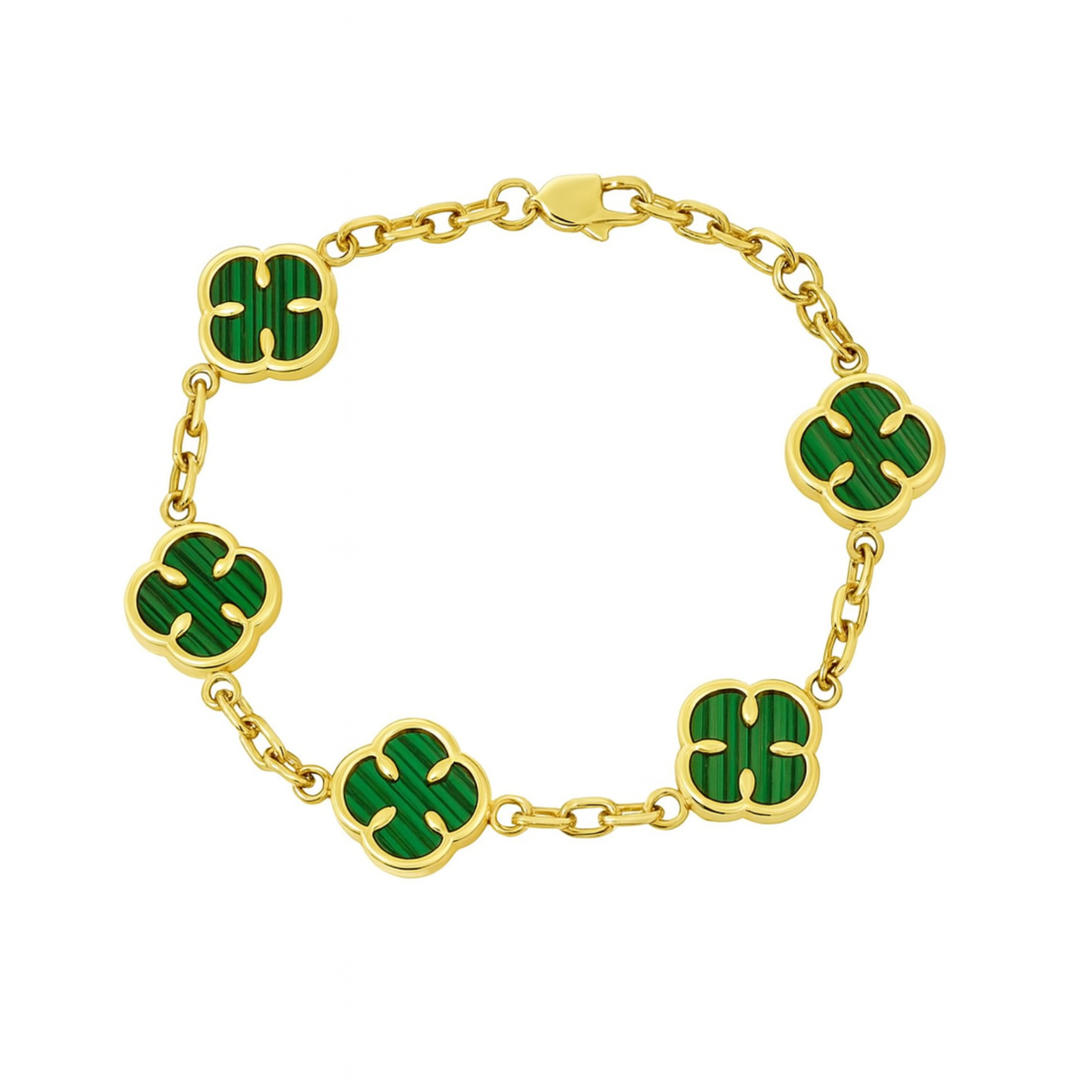 Bransoletka Koniczyna to połączenie delikatnej formy, nowoczesnej elegancji i symbolicznego znaczenia. Jej głównym motywem są subtelne elementy w kształcie czterolistnej koniczyny w odcieniach zieleni, symbolizujące szczęście, harmonię i pozytywną energię. Każdy z nich osadzony jest w pozłacanej oprawie, której blask pięknie kontrastuje z głębią zielonego koloru.