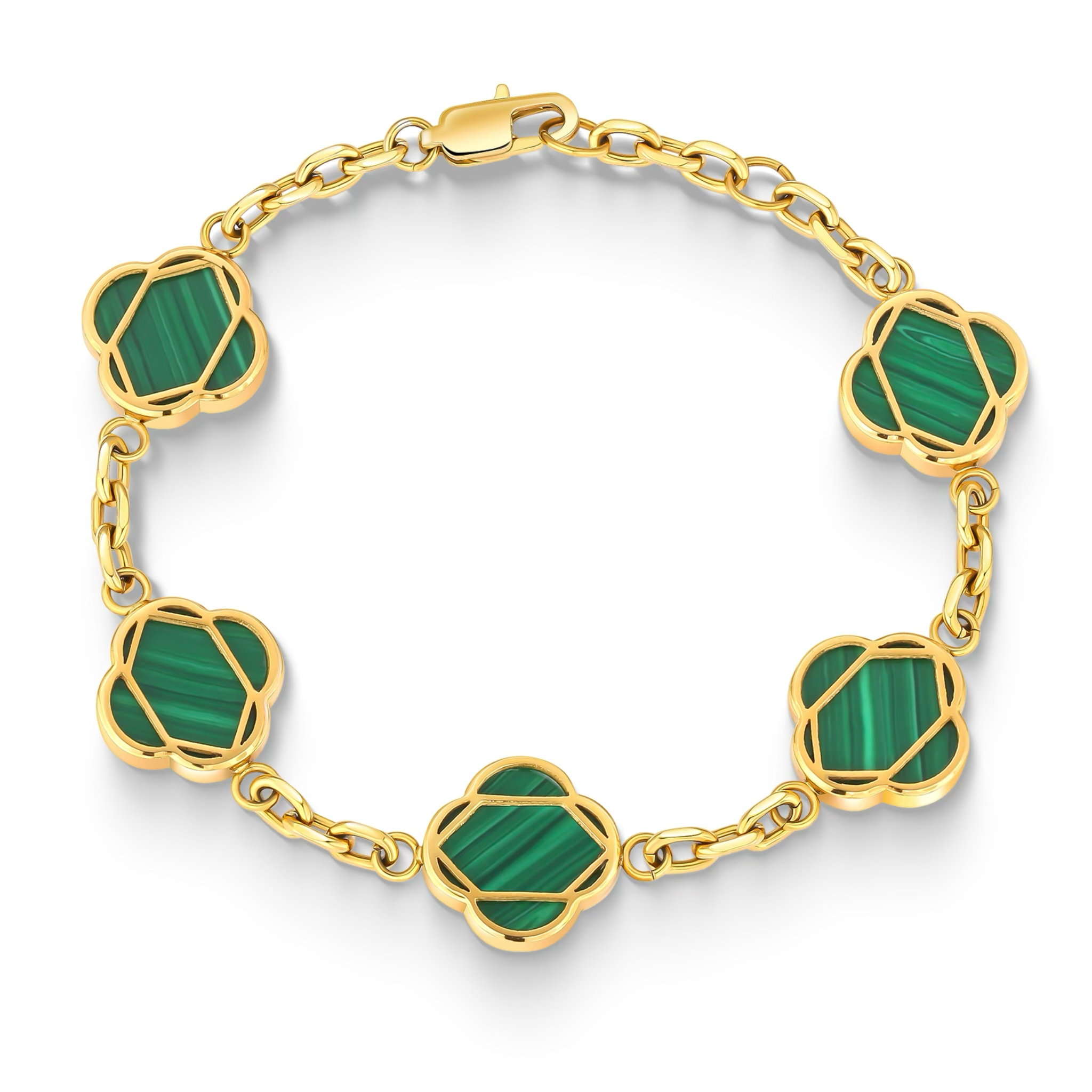 Bransoletka Koniczyna to połączenie delikatnej formy, nowoczesnej elegancji i symbolicznego znaczenia. Jej głównym motywem są subtelne elementy w kształcie czterolistnej koniczyny w odcieniach zieleni, symbolizujące szczęście, harmonię i pozytywną energię. Każdy z nich osadzony jest w pozłacanej oprawie, której blask pięknie kontrastuje z głębią zielonego koloru.