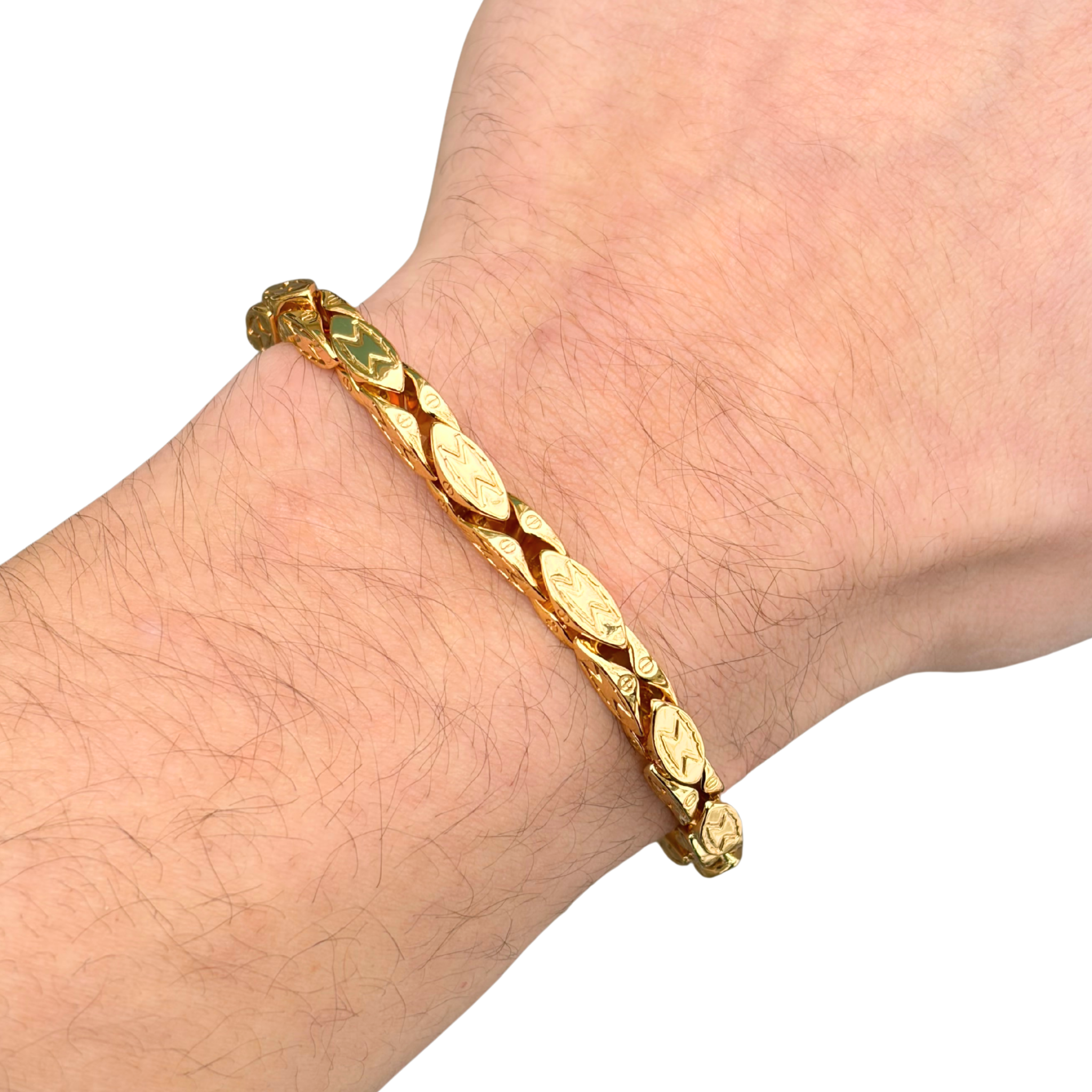 Bransoletka Magnacka Złota 5 mm to elegancki i stylowy dodatek o wyrafinowanym charakterze. Jej geometryczny splot tworzy regularną, pełną strukturę, która przyciąga uwagę subtelnym blaskiem i precyzją wykonania. Złote wykończenie nadaje jej prestiżu, a szerokość 5 mm sprawia, że idealnie balansuje między delikatnością a wyrazistością. To doskonały wybór dla osób, które cenią elegancję w klasycznym, ale nowoczesnym wydaniu – biżuteria, która podkreśla styl i pewność siebie każdego dnia.