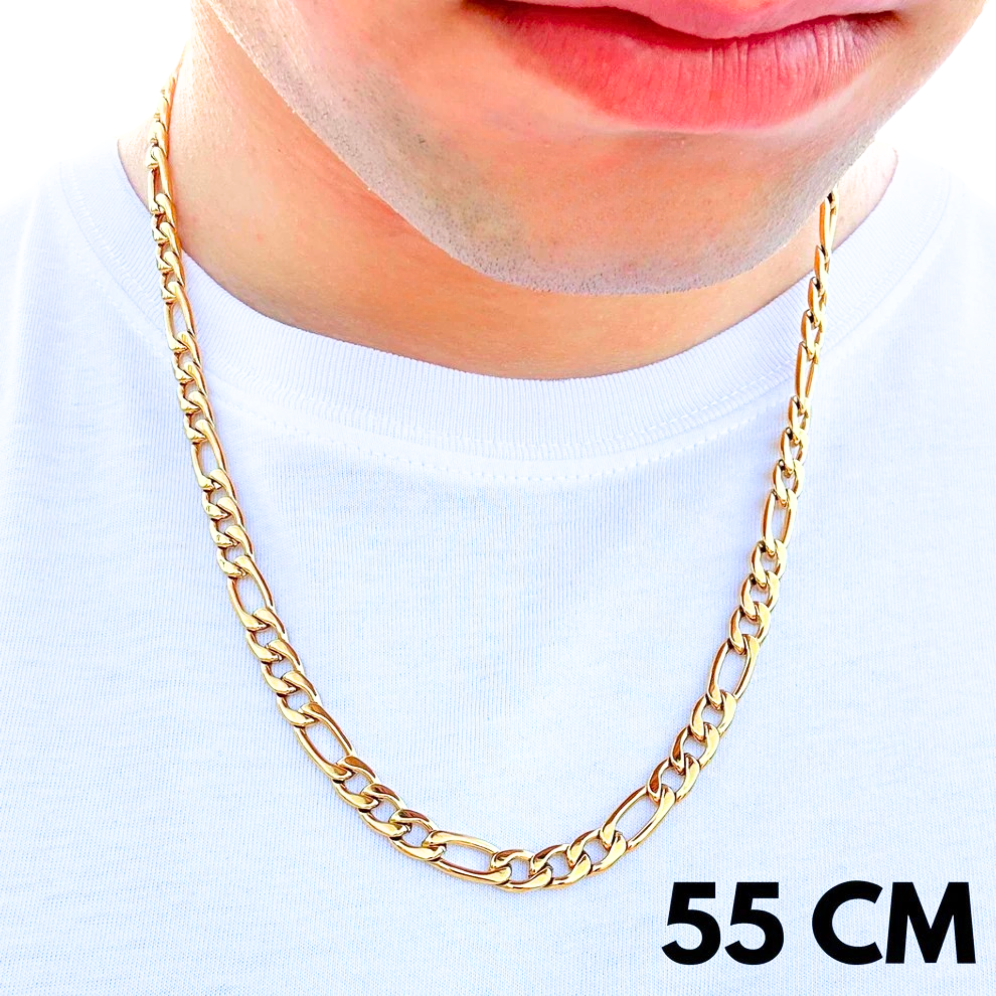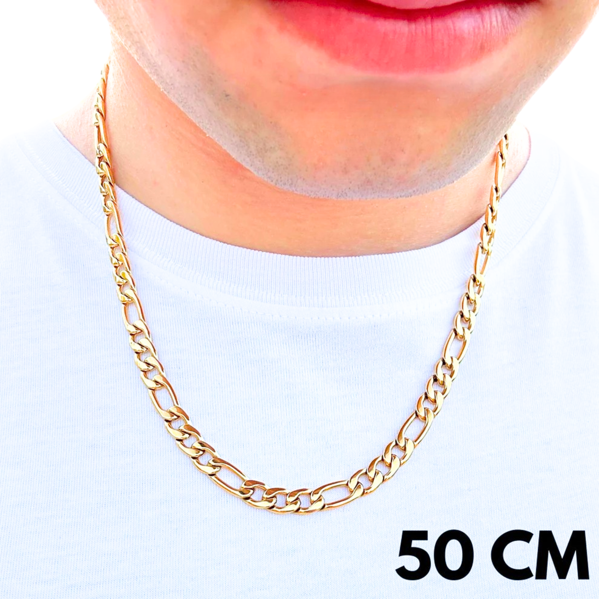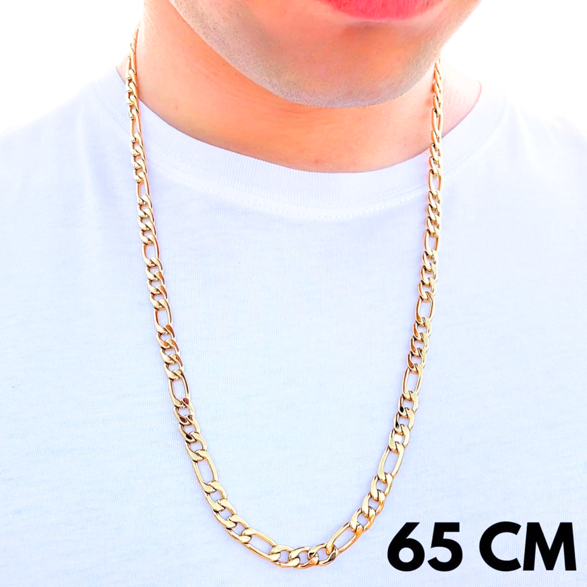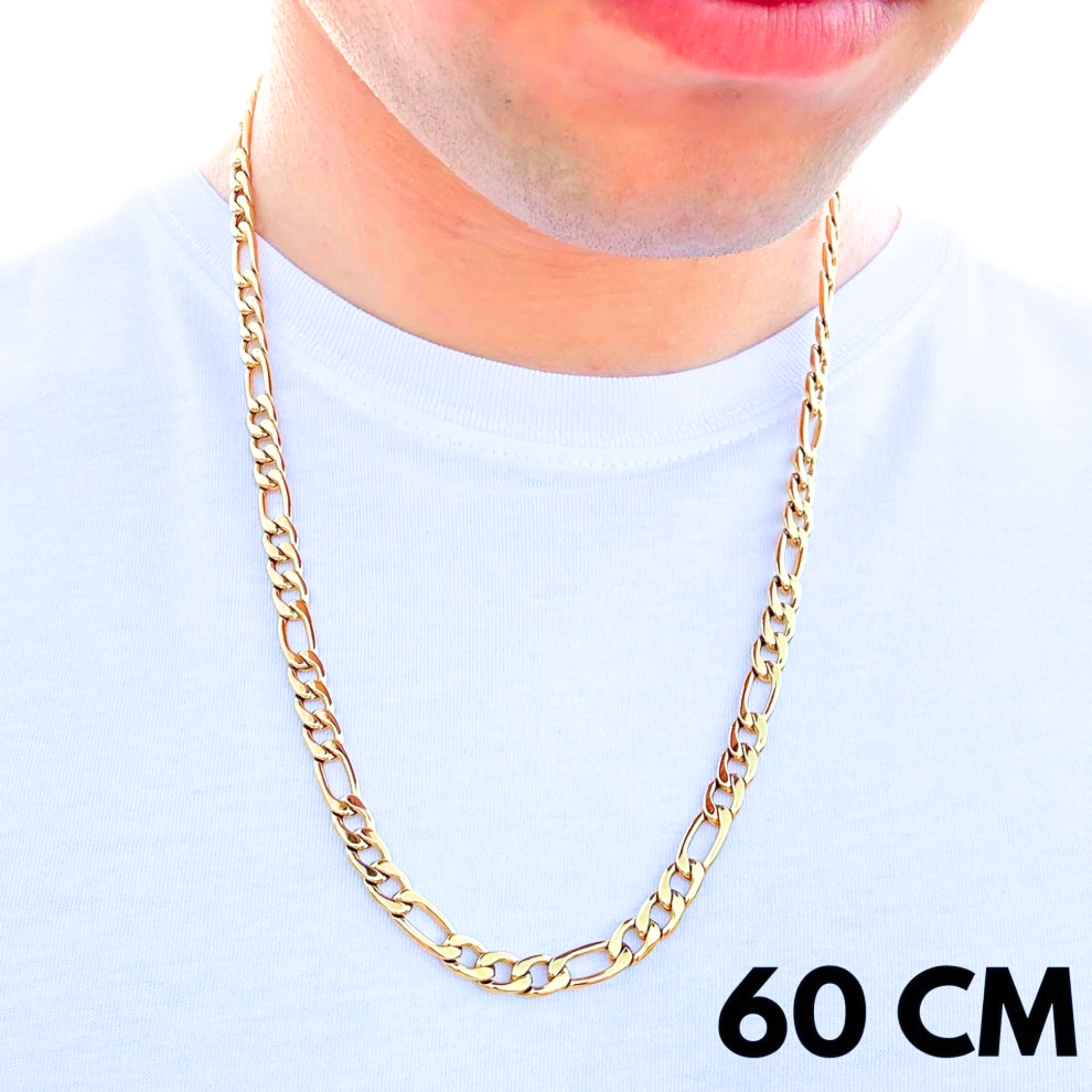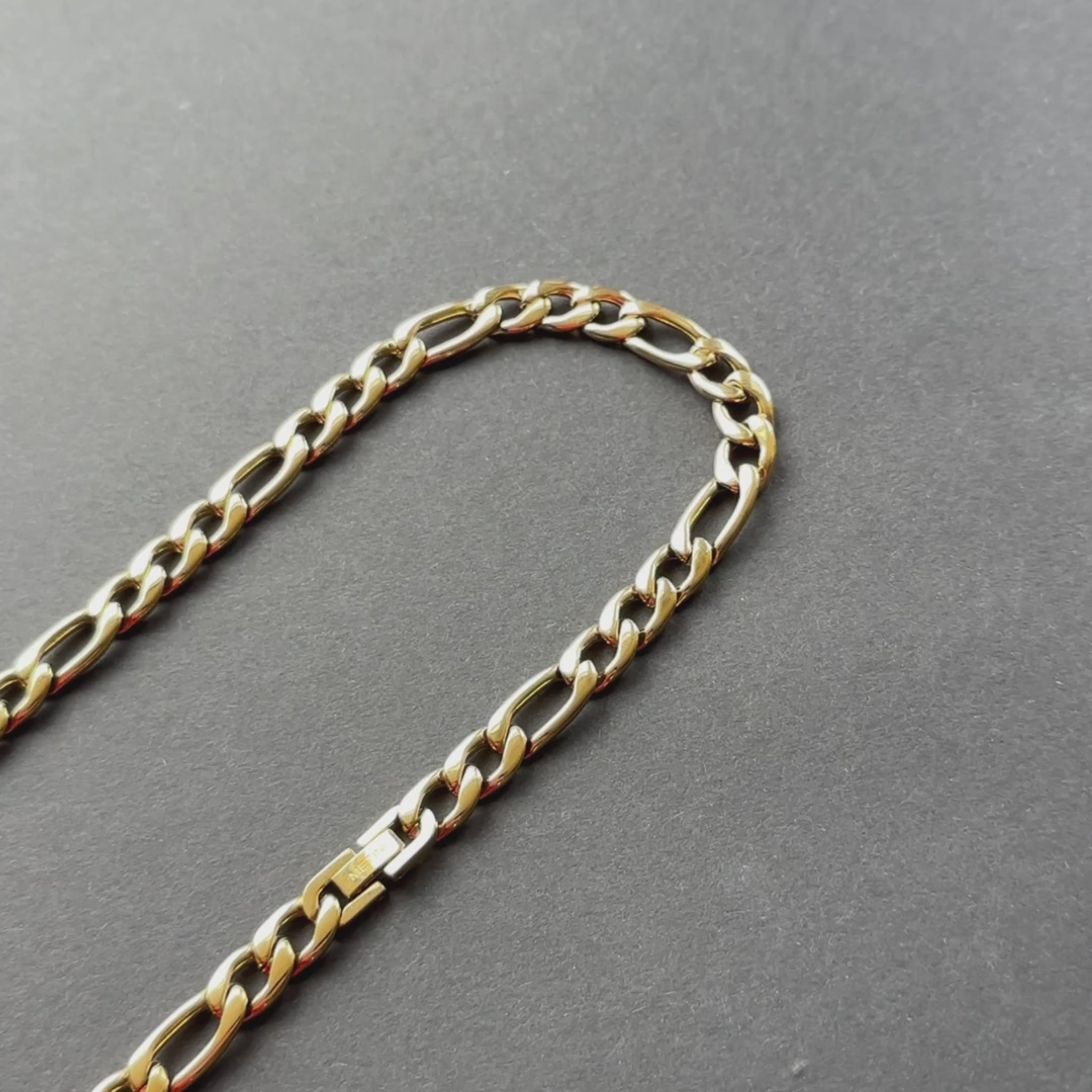 Wyrazisty łańcuch o splocie Figaro (7 mm) to klasyka męskiej biżuterii w luksusowym wydaniu. Charakterystyczny rytm ogniw — jedno dłuższe przeplatane trzema krótszymi — nadaje mu unikalny, elegancki wygląd i przyciąga uwagę swoją symetrią oraz masywnym stylem. Złote wykończenie podkreśla prestiż i pewność siebie, sprawiając, że łańcuch idealnie wpisuje się w modę streetwear, hip-hop oraz premium. To doskonały wybór dla osób, które cenią mocny, stylowy akcent i chcą wyróżniać się elegancją połączoną z odważnym charakterem.