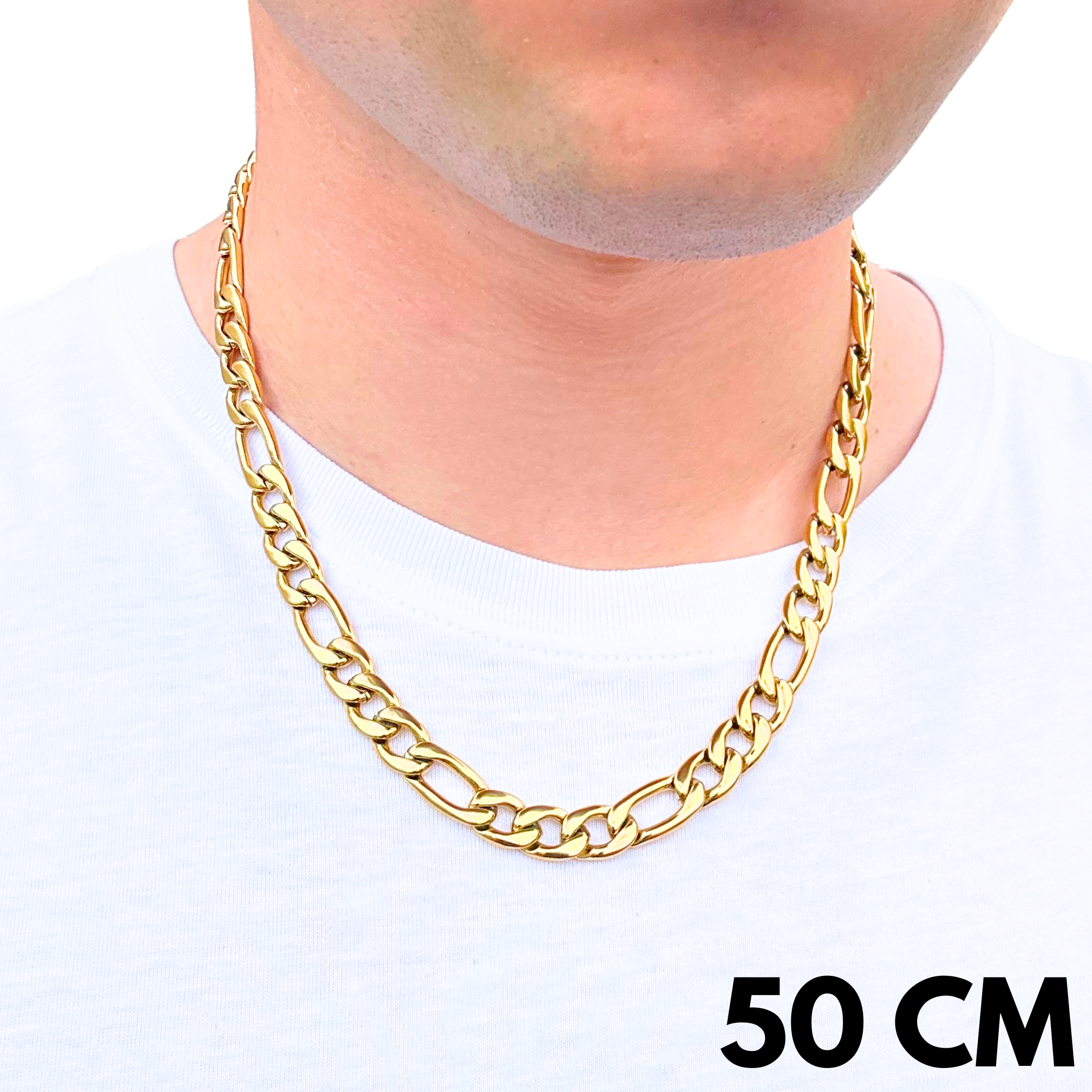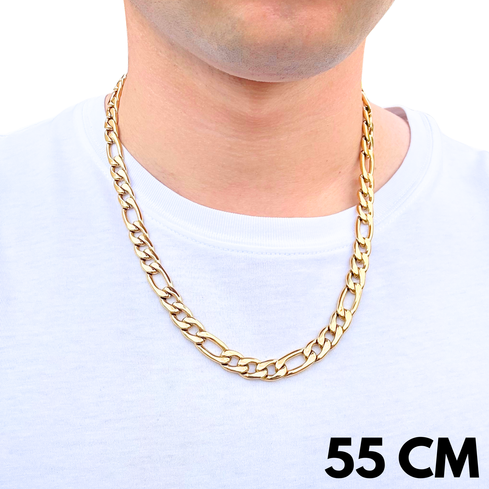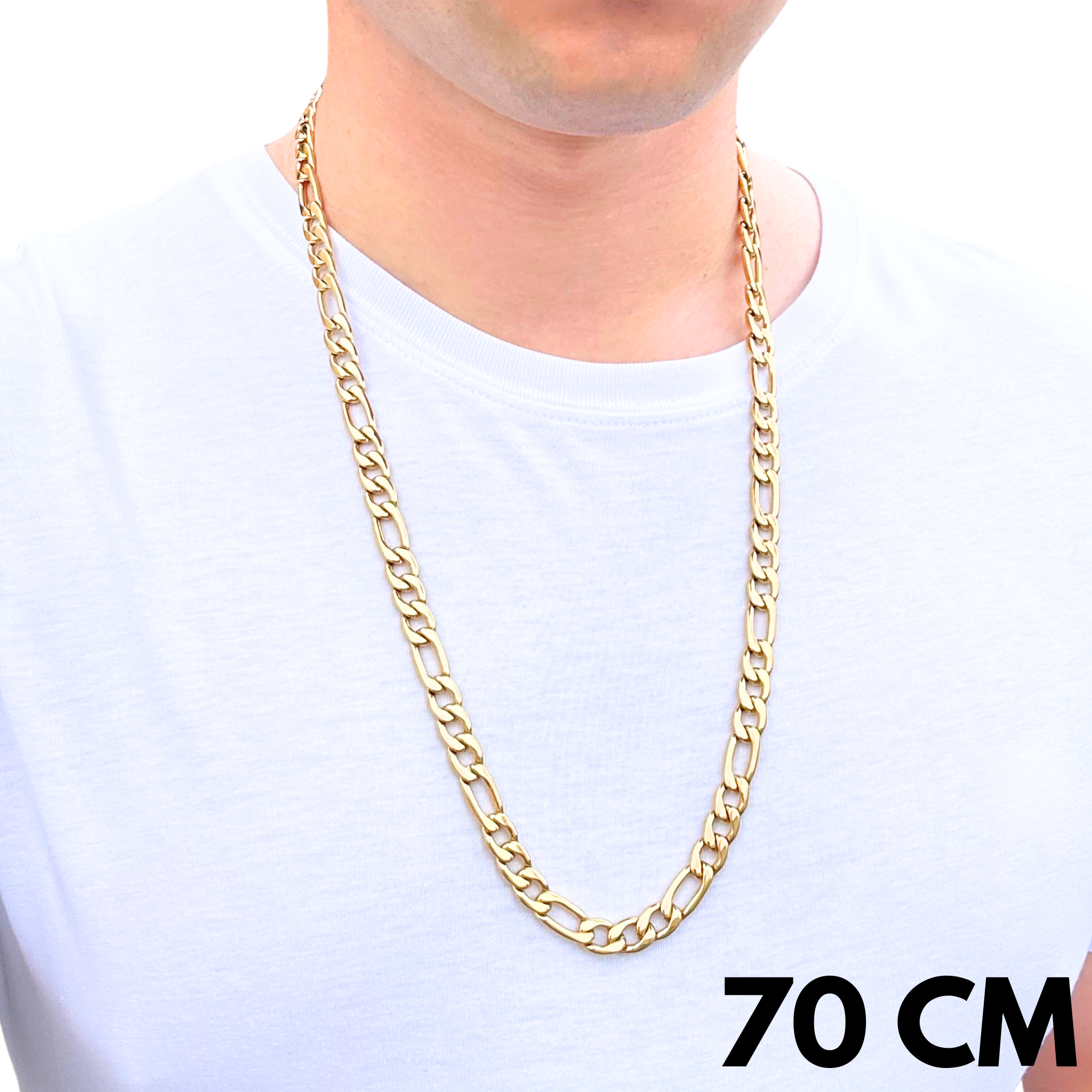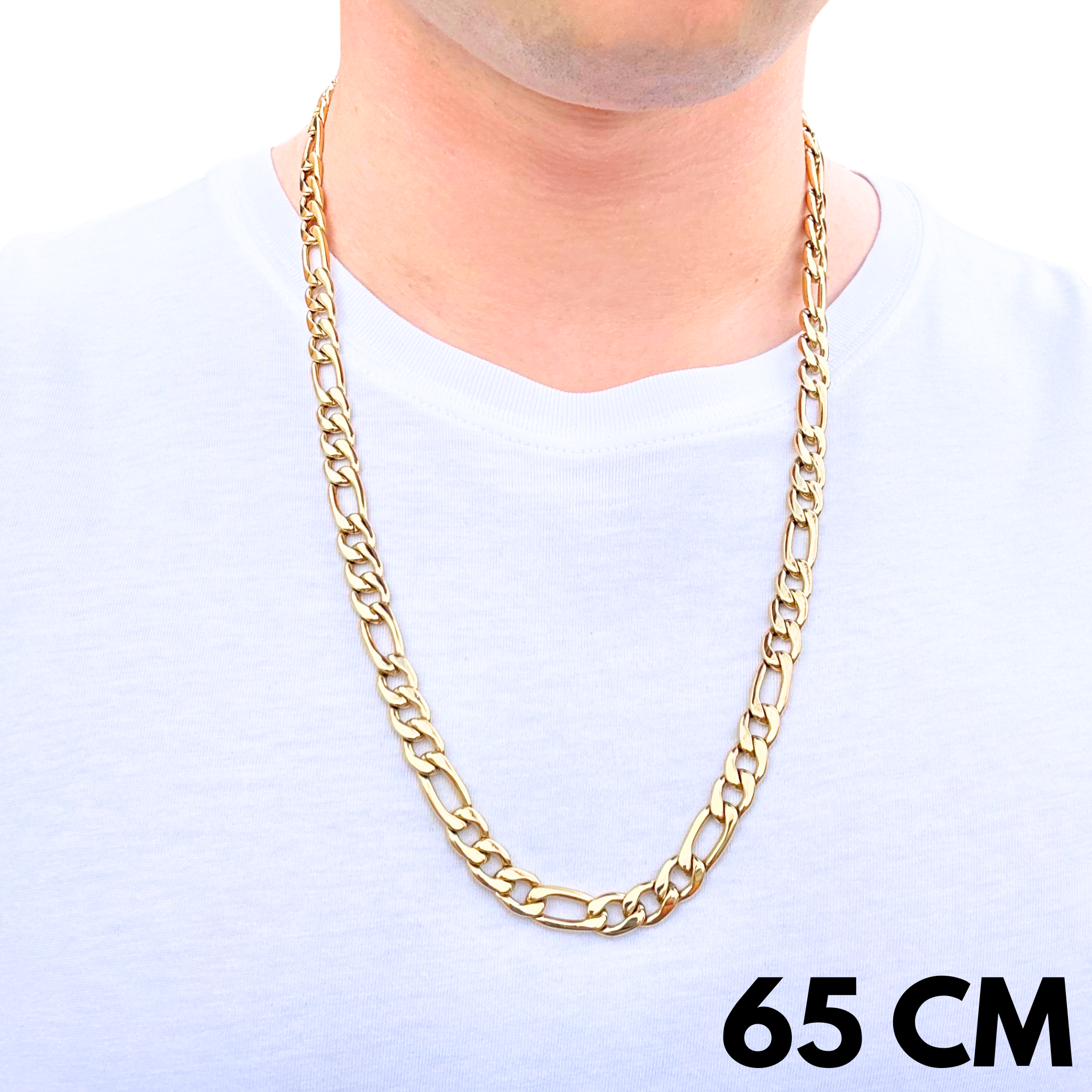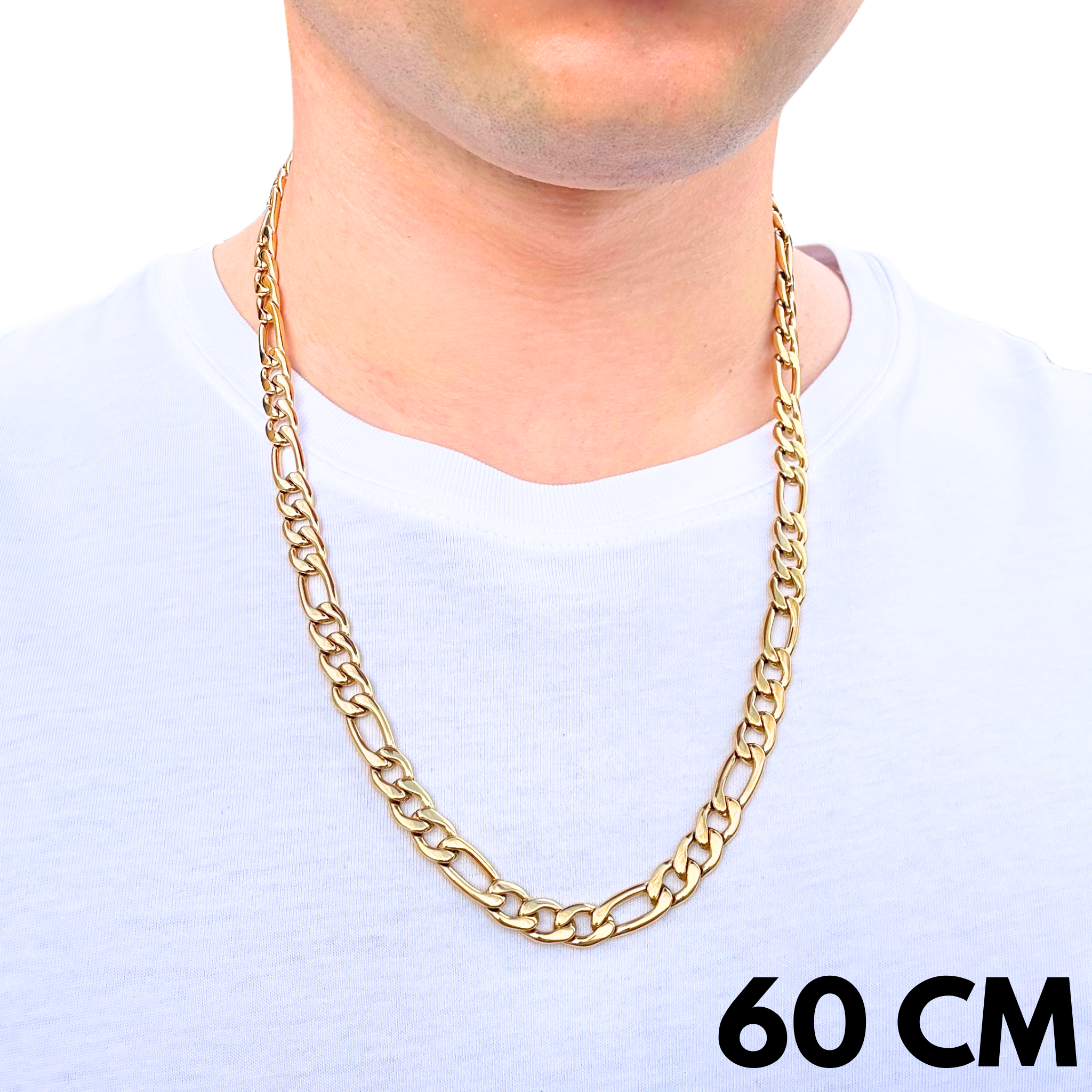 Wyrazisty łańcuch o splocie Figaro (9 mm) to klasyka męskiej biżuterii w luksusowym wydaniu. Charakterystyczny rytm ogniw — jedno dłuższe przeplatane trzema krótszymi — nadaje mu unikalny, elegancki wygląd i przyciąga uwagę swoją symetrią oraz masywnym stylem. Złote wykończenie podkreśla prestiż i pewność siebie, sprawiając, że łańcuch idealnie wpisuje się w modę streetwear, hip-hop oraz premium. To doskonały wybór dla osób, które cenią mocny, stylowy akcent i chcą wyróżniać się elegancją połączoną z odważnym charakterem.