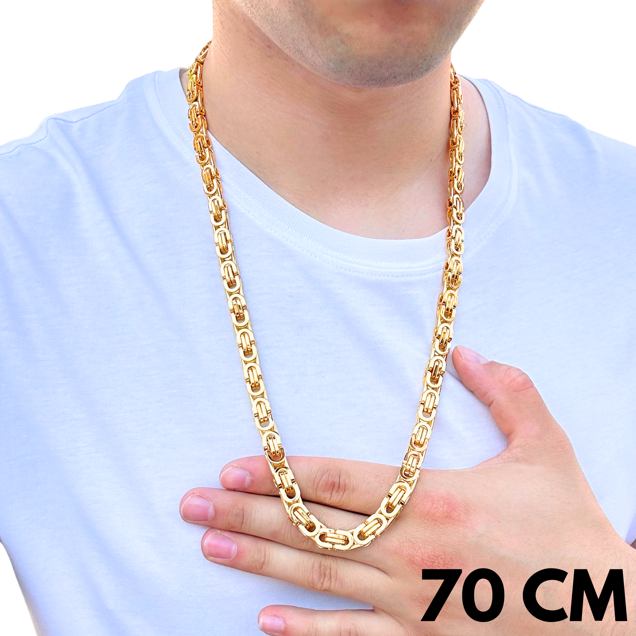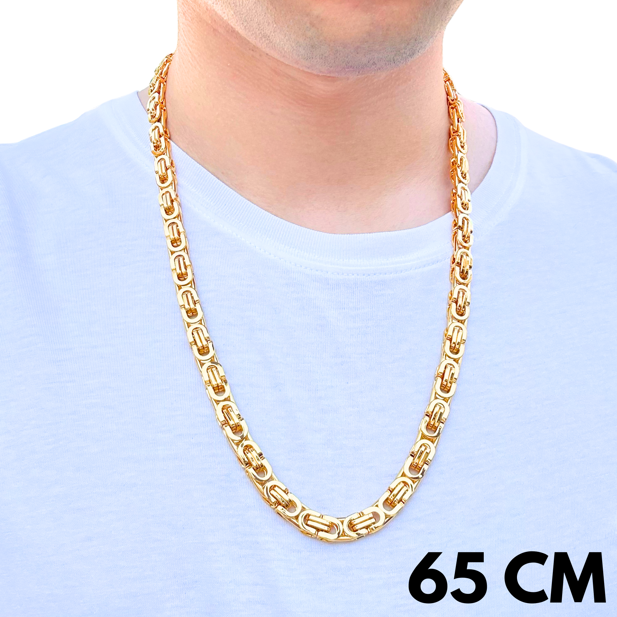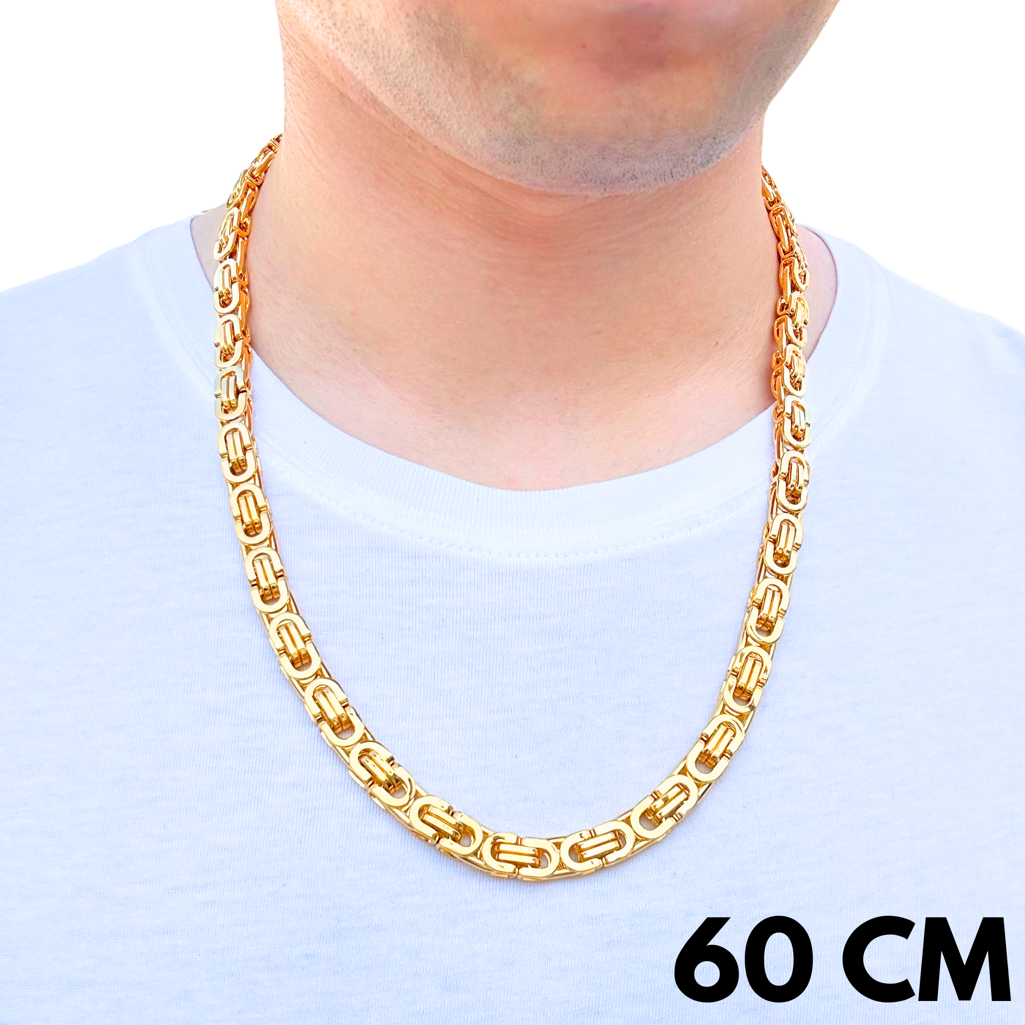 Szlachecki Złoty 8 mm to majestatyczny łańcuch o ozdobnym splocie, którego złoty blask symbolizuje luksus i pewność siebie. To model wyrazisty, ale wciąż elegancki, doskonały do podkreślenia wyjątkowych okazji i stylizacji pełnych klasy.