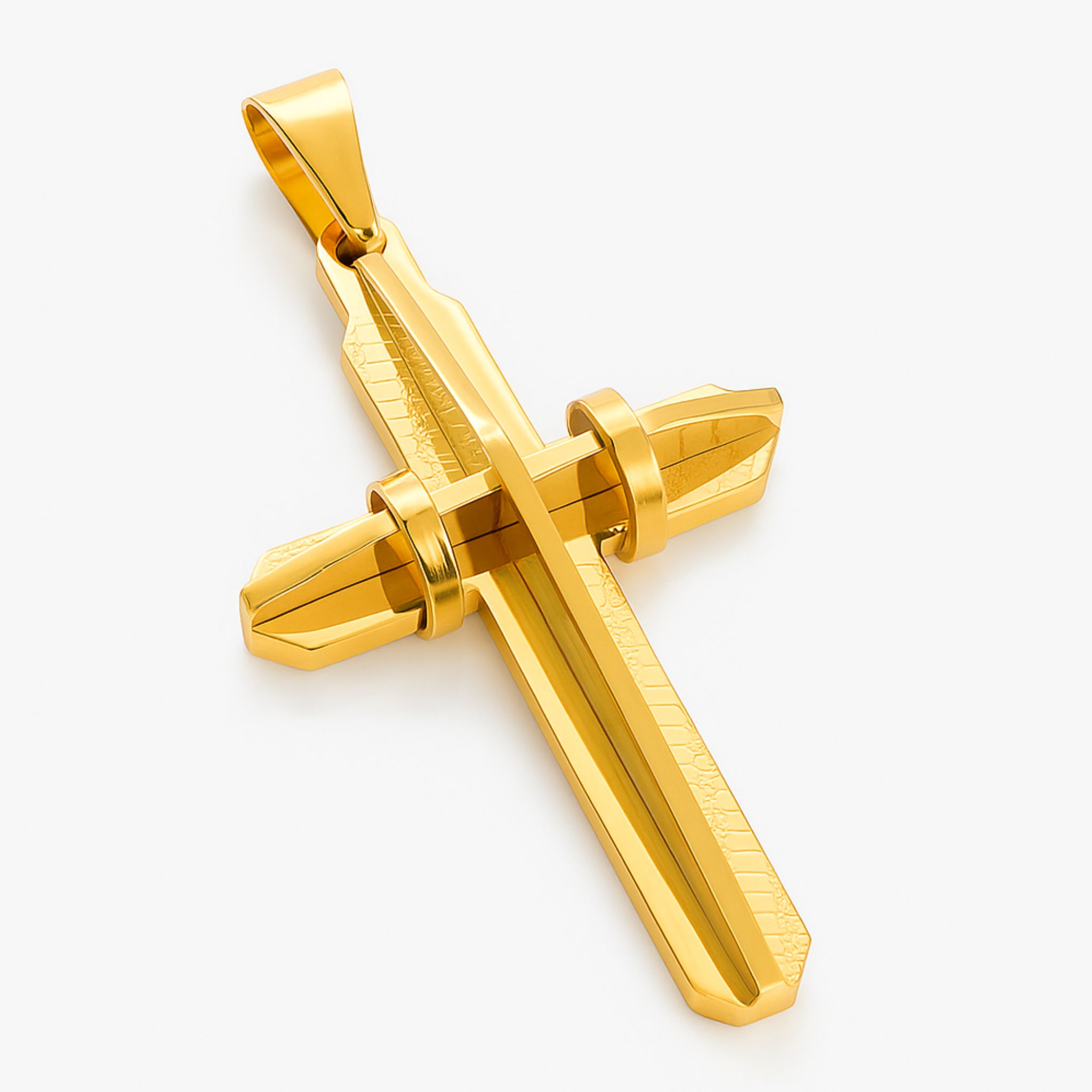 Ten pozłacany krzyż to połączenie nowoczesnej formy z klasycznym symbolem. Główna część zawieszki ma dynamiczny, metaliczny rdzeń 3D z ostrymi krawędziami i geometrycznym profilem, który przecina matowioną powierzchnię zdobioną strukturalnym wzorem przypominającym kamień lub sieć. Całość wykonana została ze stali nierdzewnej 316L pokrytej warstwą złota.