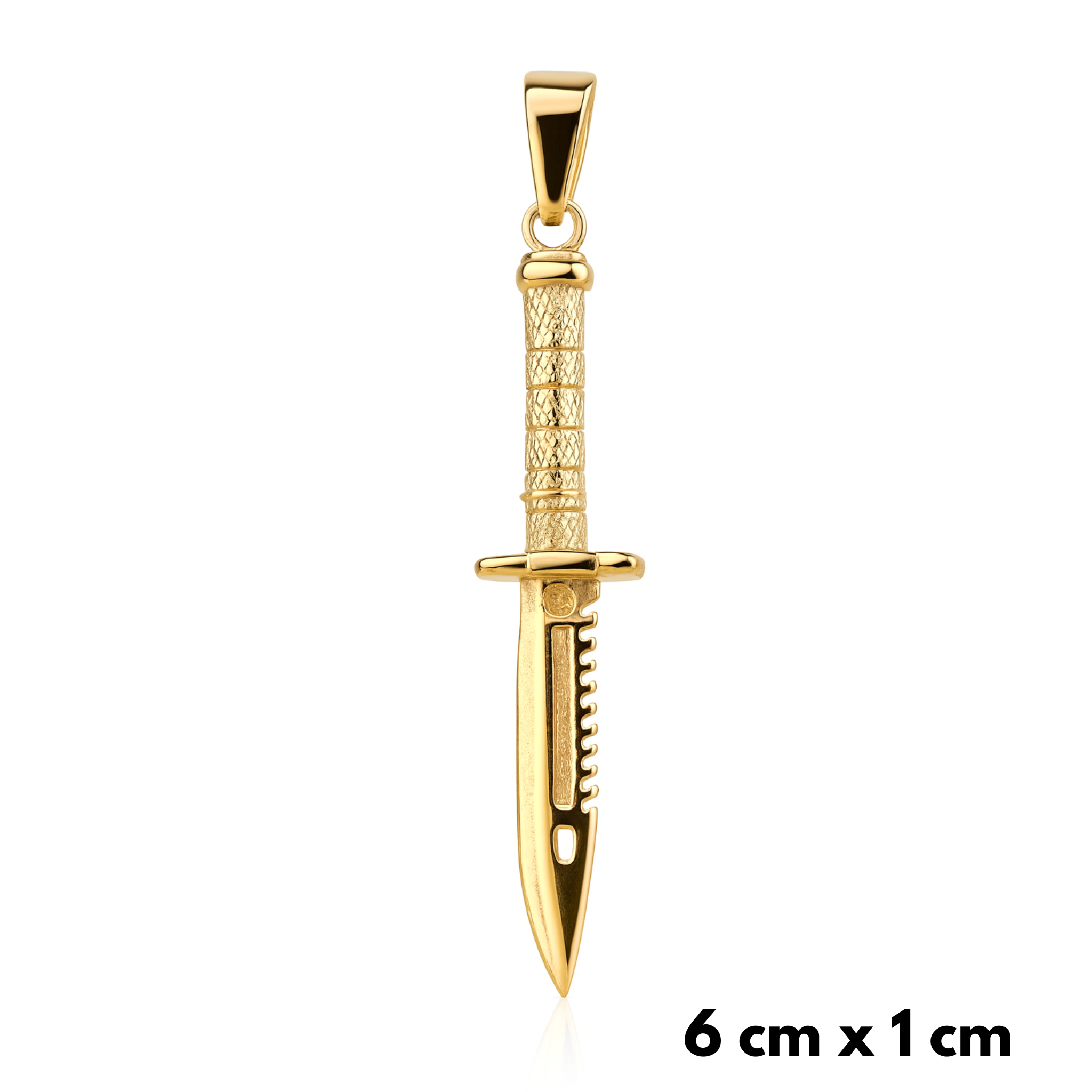 Zawieszka Knife to symbol odwagi, determinacji i gotowości do walki o własne zasady. Jej kształt inspirowany jest klasycznym nożem taktycznym – precyzyjnym, niezawodnym i pełnym charakteru. Wykonana ze stali szlachetnej klasy premium, pokryta złotym wykończeniem o lustrzanym połysku, łączy surowość z elegancją w nowoczesnym wydaniu.