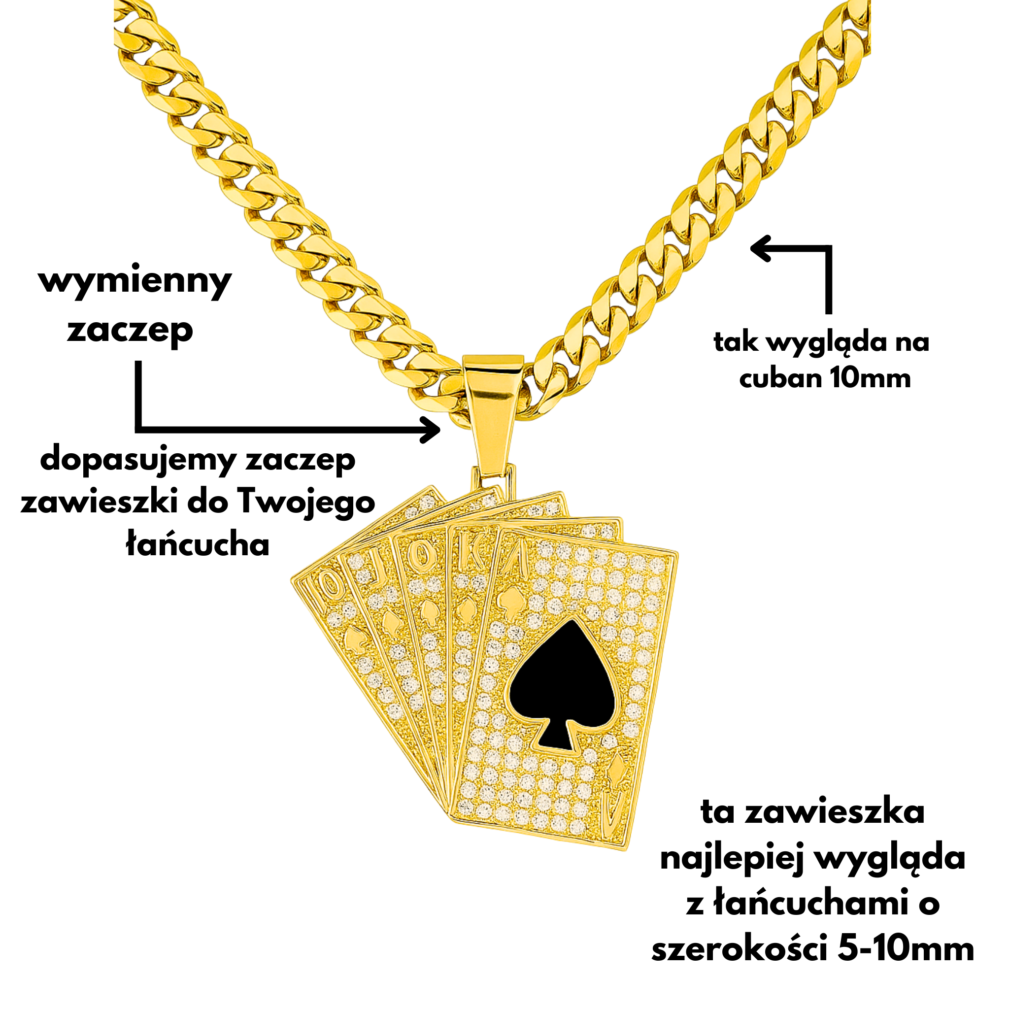 Złota masywna zawieszka w formie wachlarza kart to wyjątkowy symbol szczęścia, strategii i pewności siebie. Połączenie błyszczących cyrkonii z czarnym emaliowanym asem pik tworzy efektowny kontrast, który przyciąga wzrok i podkreśla prestiżowy charakter biżuterii. Detaliczne wykończenie i lśniąca powierzchnia sprawiają, że zawieszka prezentuje się luksusowo i elegancko. To idealny wybór dla osób, które lubią grać według własnych zasad i cenią sobie wyrazisty, niepowtarzalny styl. Doskonale dopełni zarówno streetwearowe stylizacje, jak i bardziej wyszukane outfity, stanowiąc mocny akcent pewności siebie i indywidualizmu. Będzie idealnie pasować do średnich i grubszych splotów.