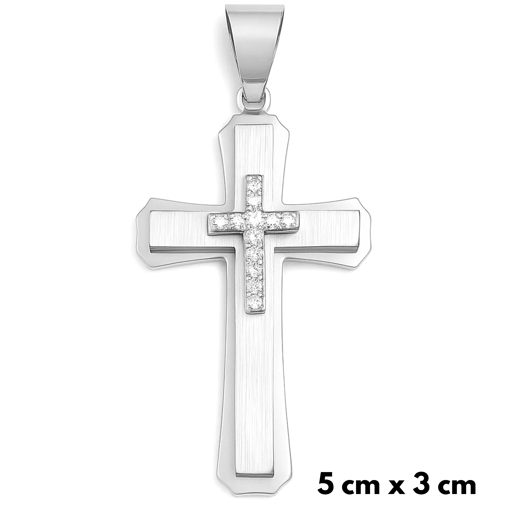 Royal Cross to masywna zawieszka stworzona z myślą o osobach ceniących elegancję, symbolikę i jakość. Składa się z dwóch poziomów: dużego krzyża o szczotkowanej powierzchni oraz nałożonego na niego mniejszego, lśniącego krzyża z cyrkoniami. Takie połączenie tworzy efekt trójwymiarowości i luksusu w nowoczesnej odsłonie. Delikatne fazowania ramion i ostre krawędzie nadają krzyżowi unikatowego charakteru.