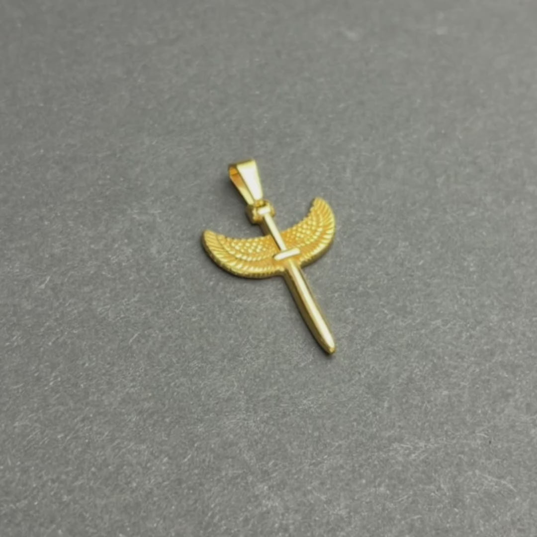 Każdy detal został opracowany z precyzją: delikatne tłoczenia skrzydeł i gładkie linie ostrza tworzą perfekcyjną harmonię między surowością a finezją. Pokrycie złotym wykończeniem nadaje całości luksusowego charakteru i sprawia, że zawieszka błyszczy z wyjątkową głębią.