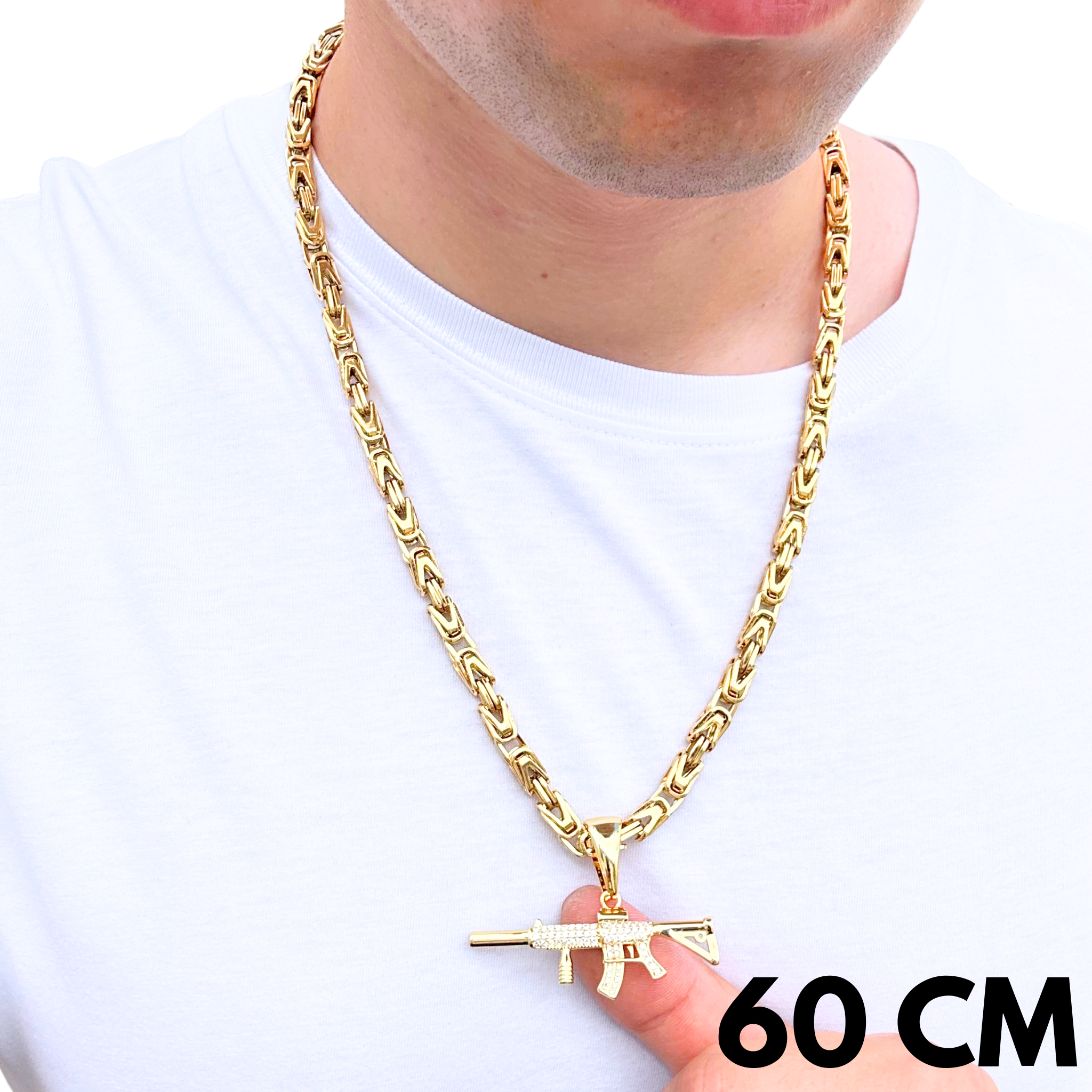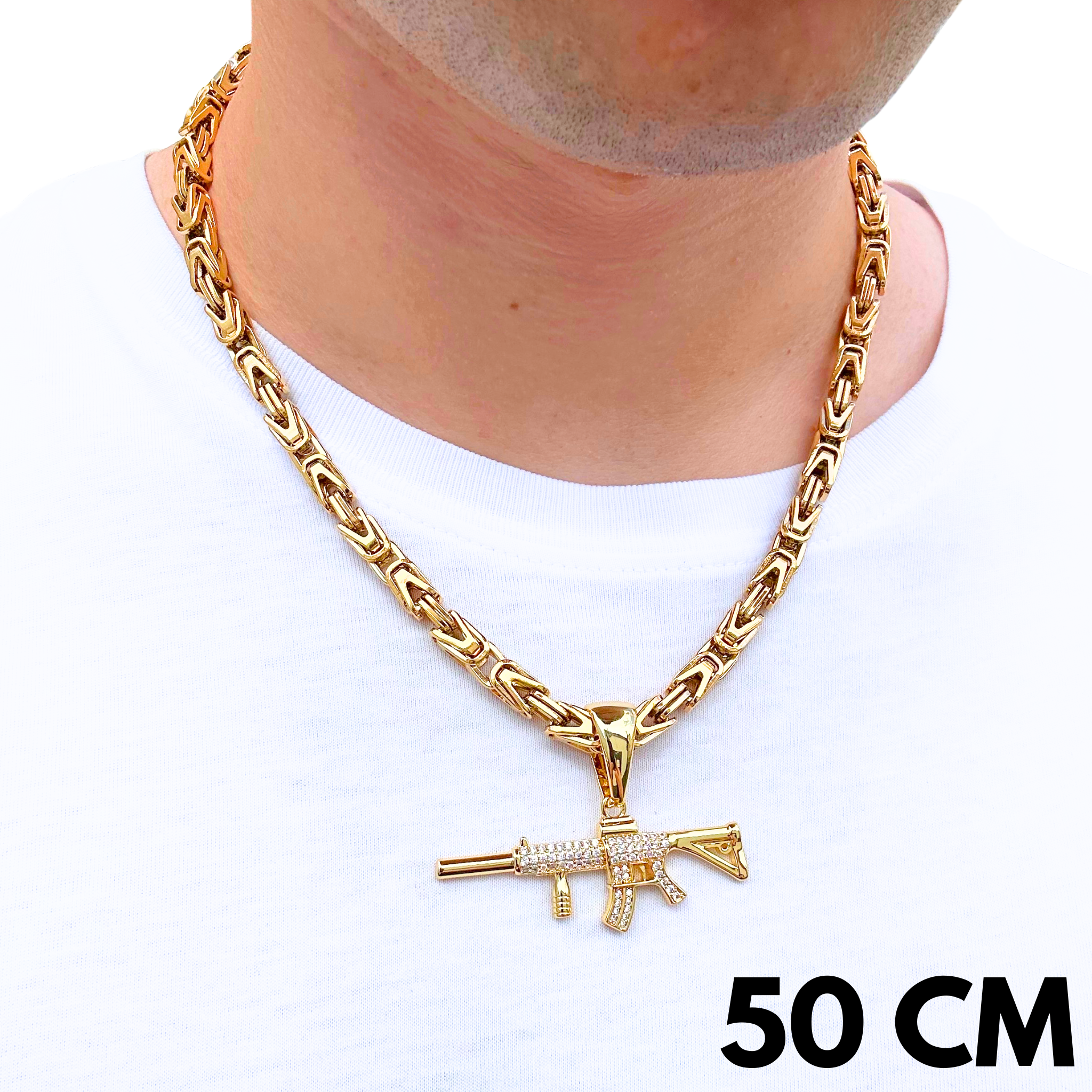 Ten zestaw łączy łańcuch w splocie cesarskim o szerokości 6 mm z wyrazistą zawieszką M4 – tworząc biżuterię, która nie przechodzi niezauważona. Splot cesarski to symbol solidności i prestiżu, a złota powłoka nadaje mu blasku i elegancji. Zawieszka M4, inspirowana kultowym karabinkiem, nawiązuje do niezależności, siły i pewności siebie. To zestaw dla osób, które chcą wyrażać osobowość odważnie i bez kompromisów – łączy styl, wyraz i energię w jednej formie.