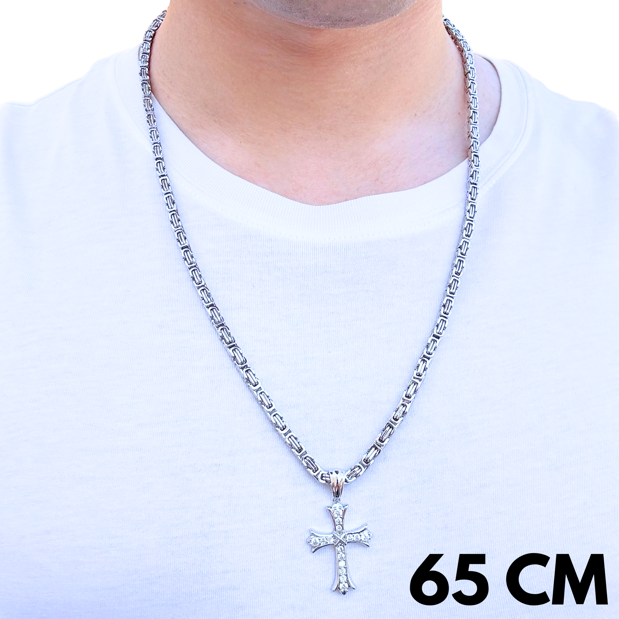 Stylowy zestaw łączy subtelny łańcuch Królewski o średnicy 4 mm z elegancką zawieszką Grand Cross ozdobioną lśniącymi cyrkoniami. Zawieszka Grand Cross wyróżnia się finezyjnym kształtem i luksusowym blaskiem, będąc jednocześnie ponadczasowym symbolem w eleganckiej odsłonie. Ten komplet to doskonały wybór dla osób, które cenią połączenie klasycznej formy i wyjątkowego detalu – idealny zarówno na co dzień, jak i na szczególne okazje.