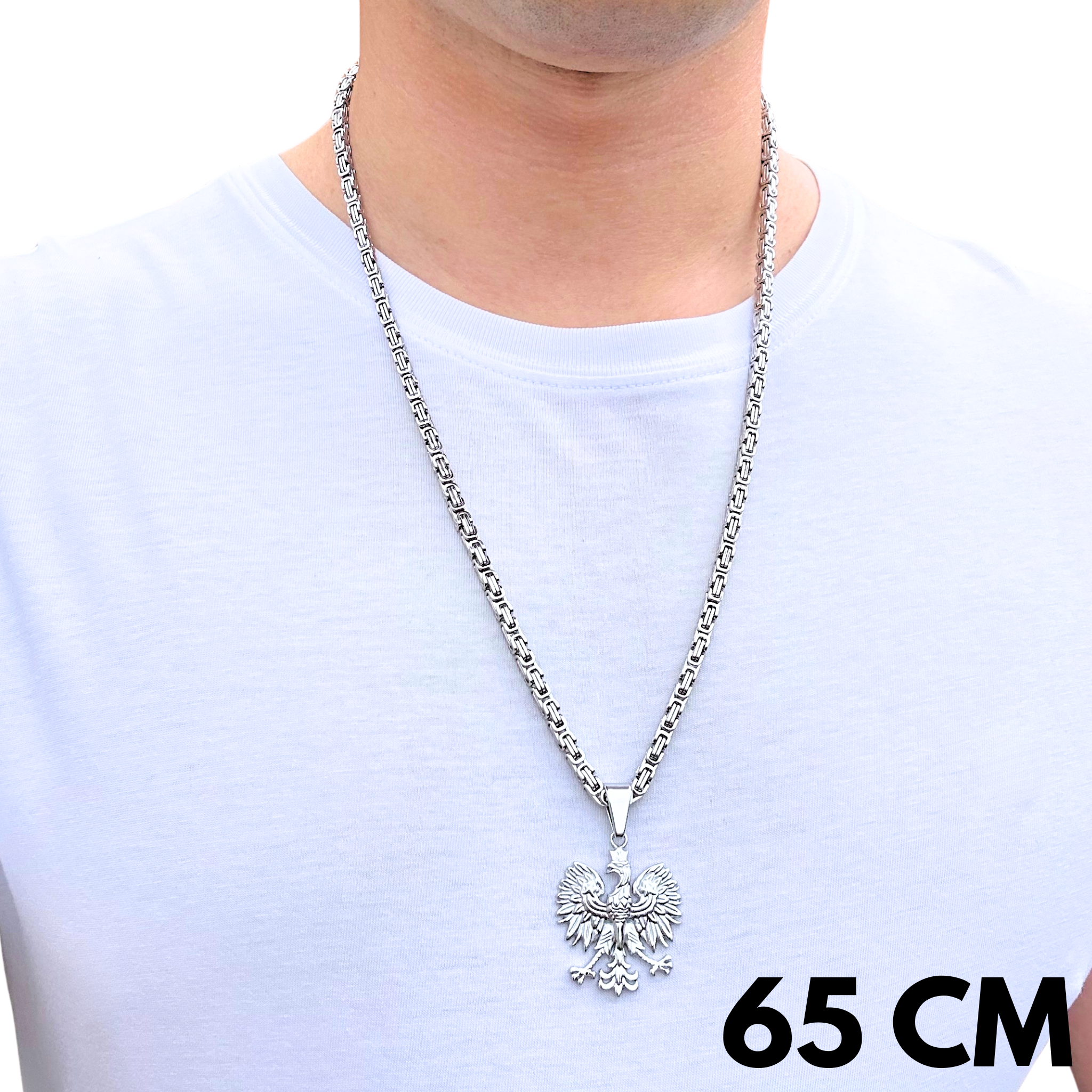 Ten wyjątkowy zestaw łączy w sobie majestat, siłę i dumę z polskiego dziedzictwa. Łańcuch o splocie królewskim (4 mm) symbolizuje potęgę, prestiż i niezłomność – cechy, które doskonale współgrają z zawieszką Orzeł wykonaną w kolorze białego złota. To połączenie elegancji i głębokiego znaczenia, niosące przesłanie odwagi, wolności i honoru.