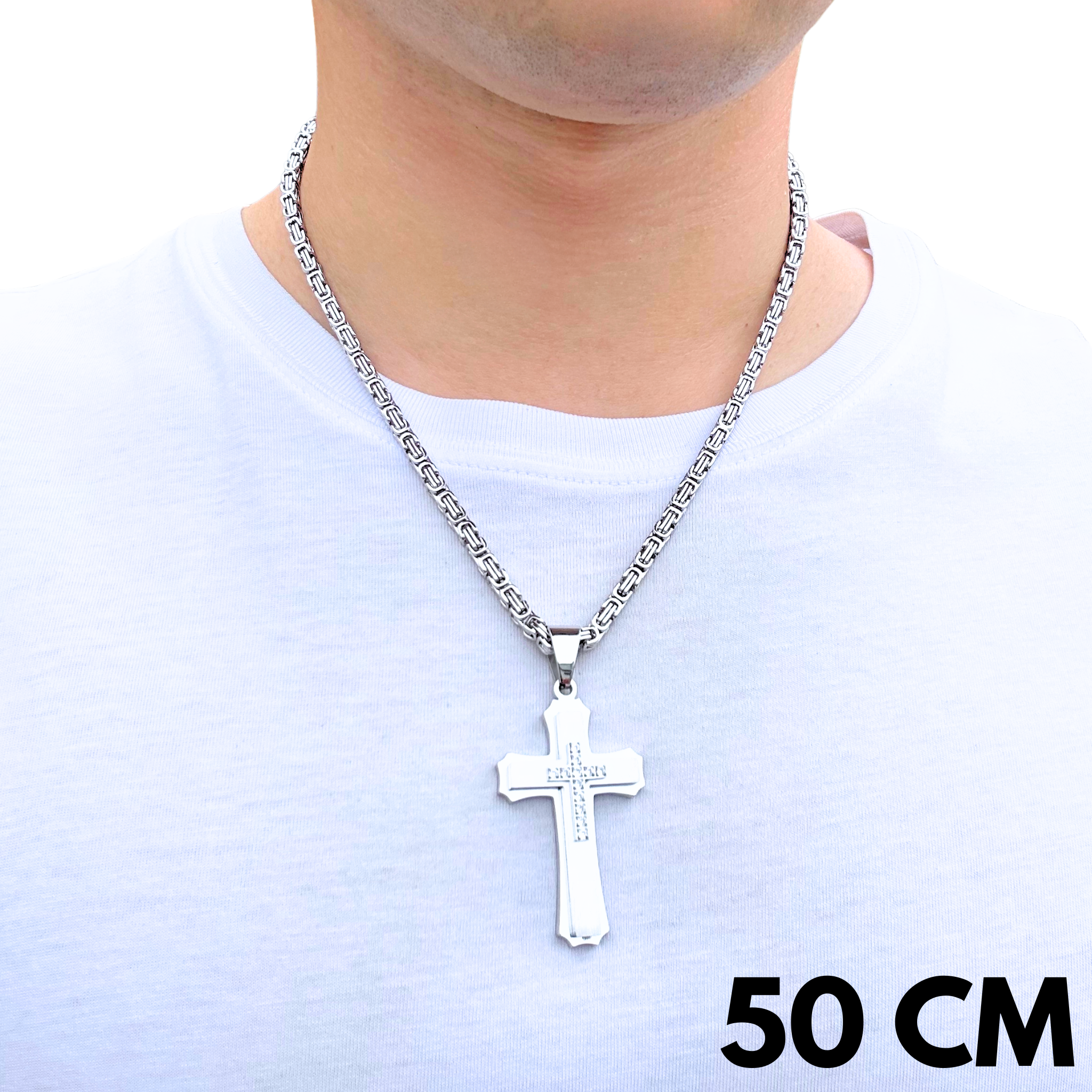 Luksusowy i pełen prestiżu zestaw, który łączy klasyczną elegancję z nowoczesnym, wyrazistym designem. Łańcuch o splocie królewskim (4 mm) zachwyca swoją masywną, symetryczną strukturą, symbolizującą władzę, siłę i niezłomność. W połączeniu z zawieszką Royal Cross w kolorze białego złota tworzy kompozycję, która emanuje majestatem i pewnością siebie.