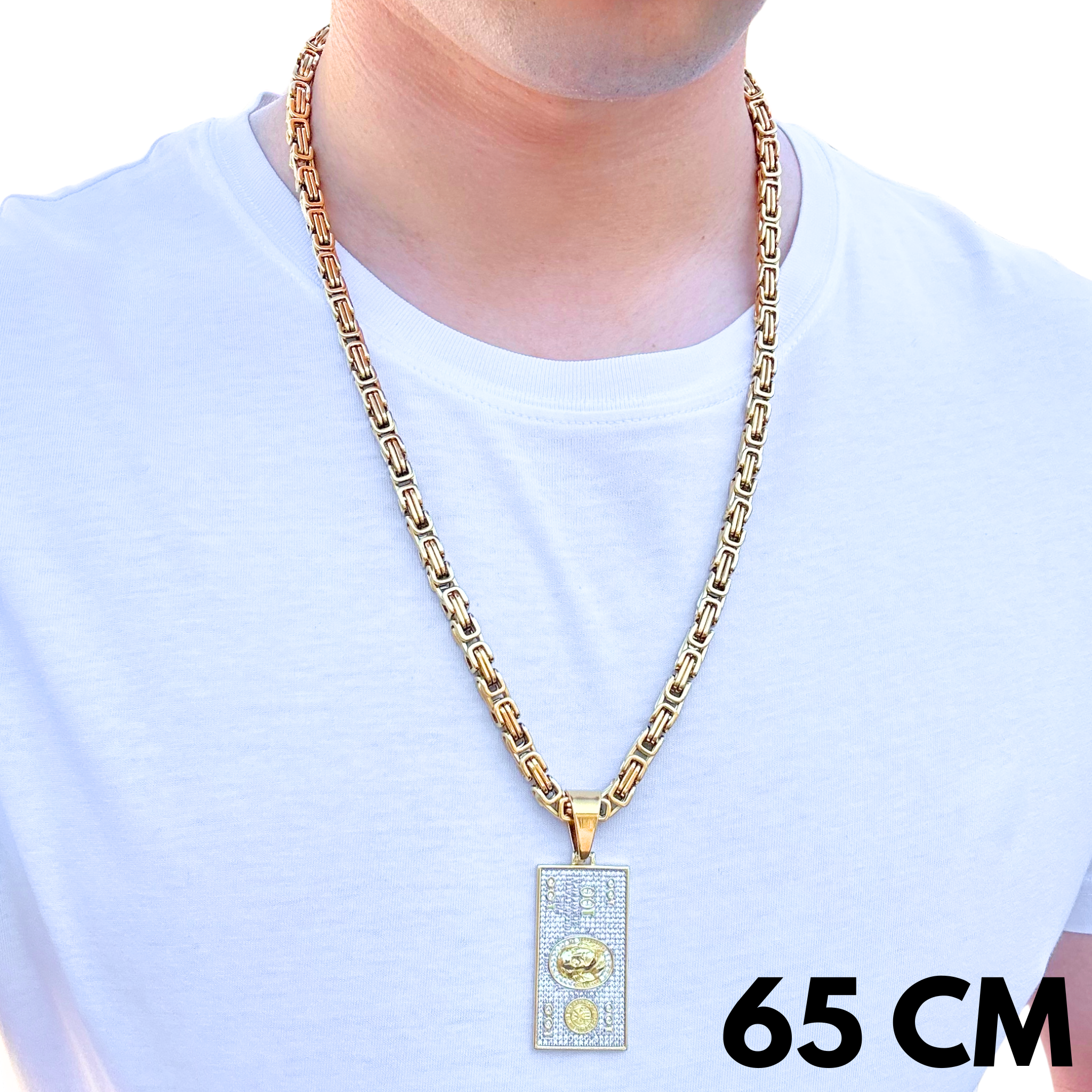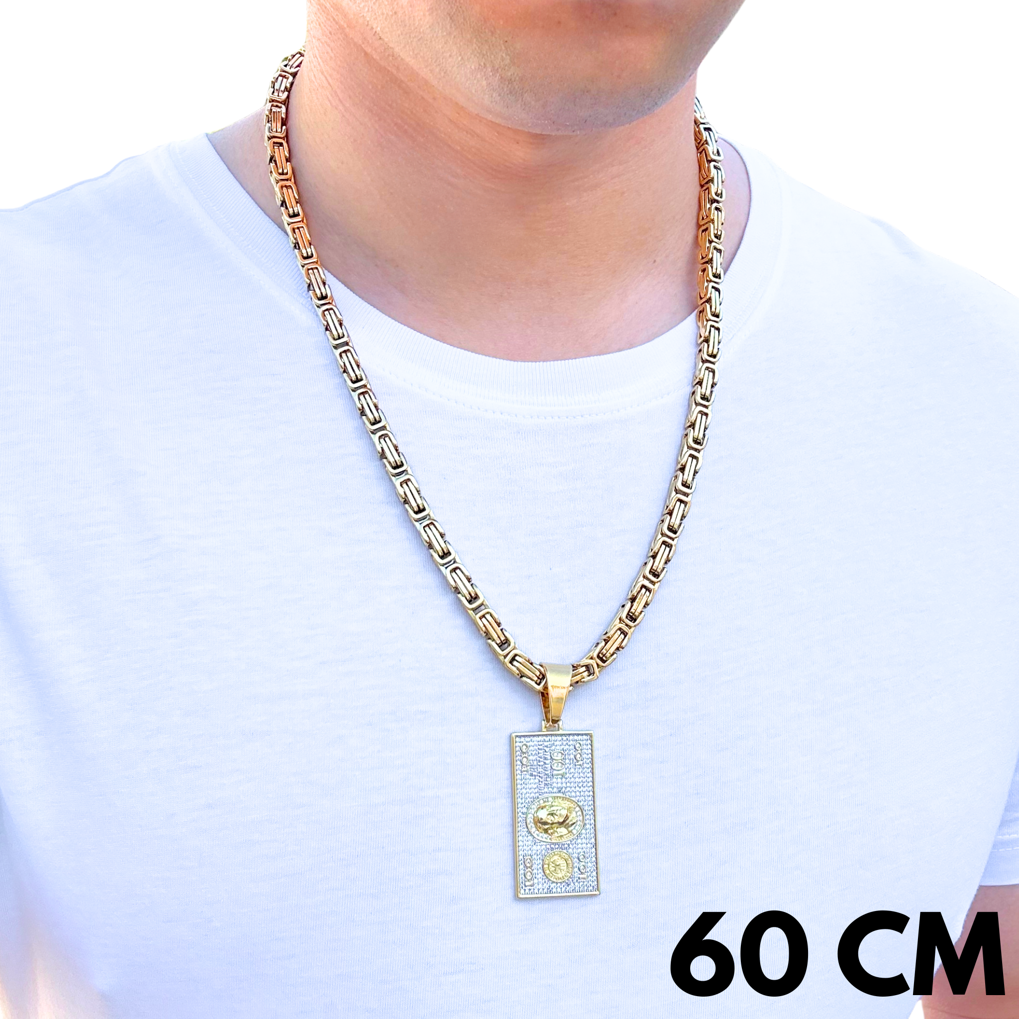 Efektowny łańcuch o królewskim splocie (6 mm) połączony z prostokątną zawieszką ozdobioną cyrkoniami i złotymi detalami tworzy zestaw, który emanuje prestiżem i pewnością siebie. Wyrazisty, geometryczny splot królewski podkreśla solidność i elegancję biżuterii, a błyszcząca zawieszka symbolizuje luksus, sukces i wyjątkowy styl. To komplet stworzony dla osób, które cenią sobie połączenie klasy, odwagi i nowoczesnego charakteru — idealny dodatek do stylizacji streetwear, hip-hop oraz premium fashion.