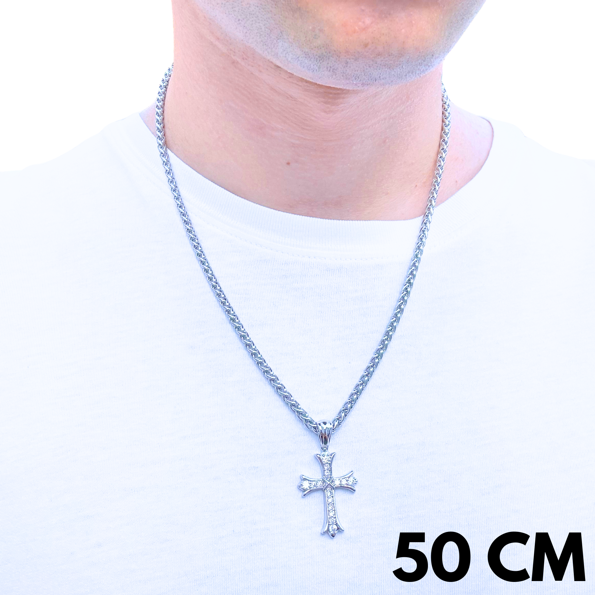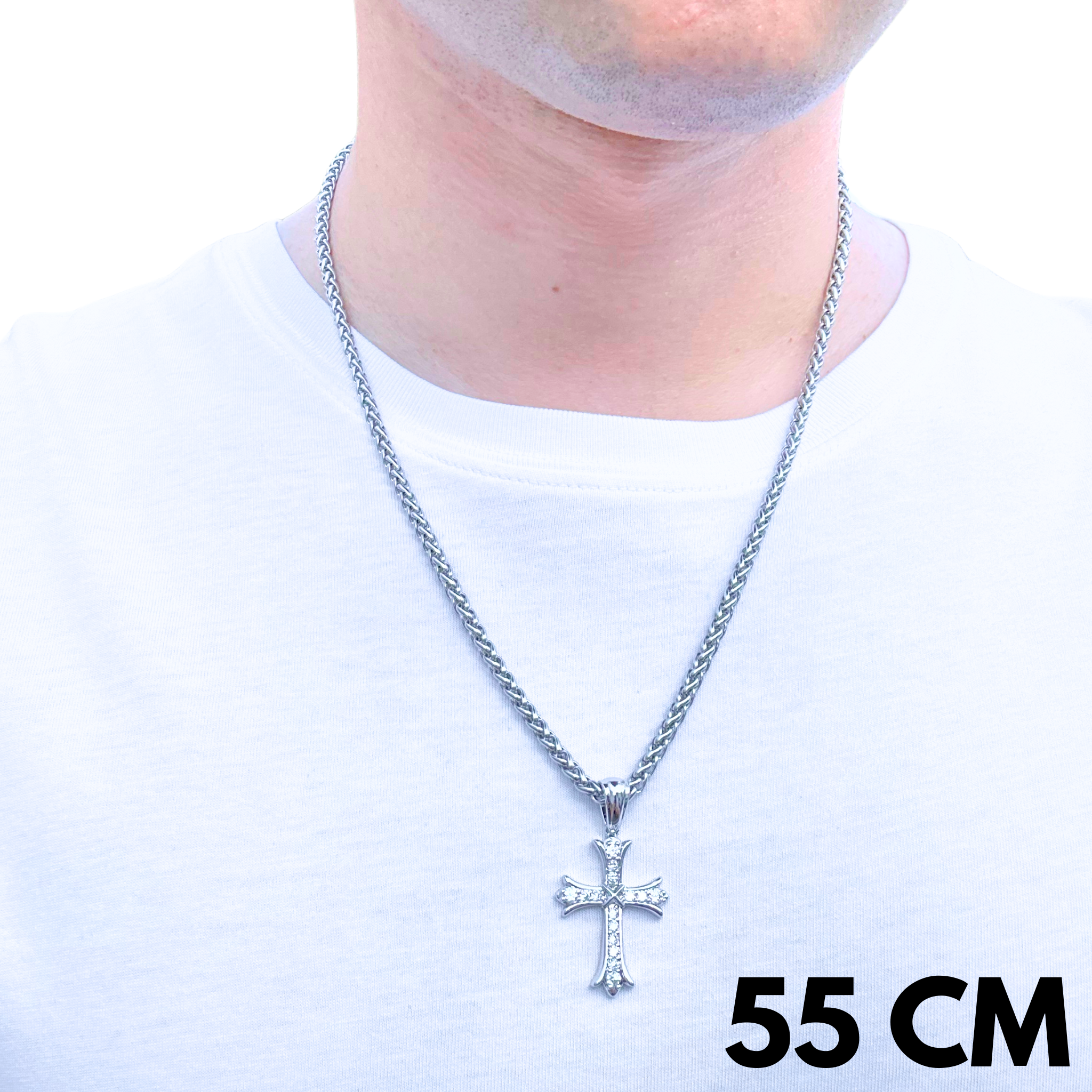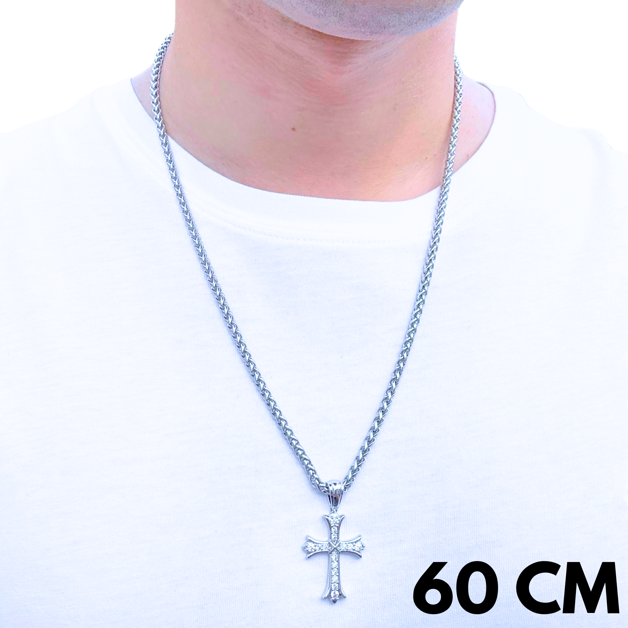 Ten zestaw łączy stalowy łańcuch w splocie pszennym (4 mm) z subtelną, zawieszką Grand Cross pokrytą Białym Złotem– tworząc kompozycję pełną lekkości i klasy. Splot pszenny przyciąga wzrok swoją naturalną, skręcaną formą, a zawieszka Grand Cross dodaje znaczenia i blasku. Wykonany ze stali nierdzewnej, zestaw ten jest trwały, odporny na codzienne użytkowanie i utrzymany w chłodnej, nowoczesnej estetyce. To idealny wybór dla tych, którzy cenią połączenie stylu, jakości i symboliki w nienachalnej formie.