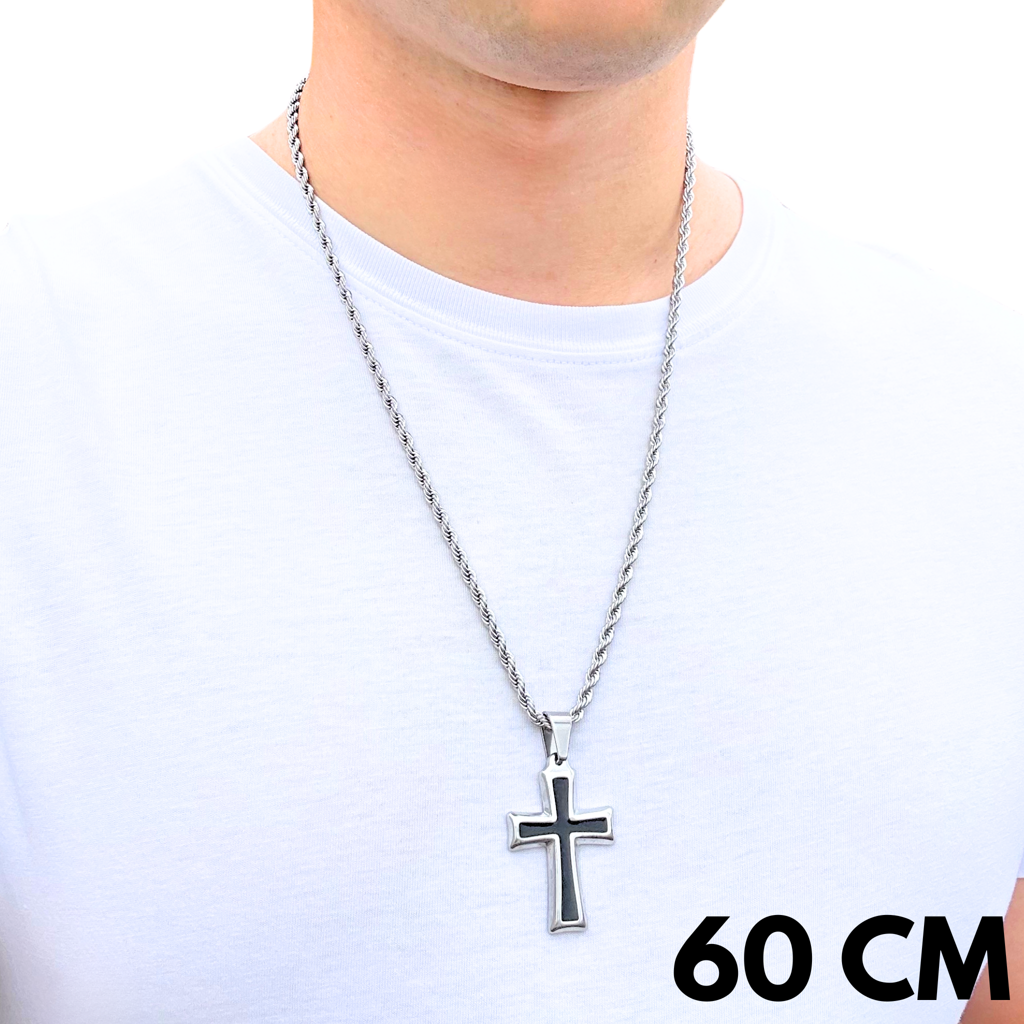 Stylowy i pełen kontrastów zestaw, który łączy klasyczną elegancję z nowoczesnym wyrazem siły. Łańcuch o splocie Rope (4 mm), inspirowany skręconym sznurem, symbolizuje trwałość, energię i dynamiczny charakter, natomiast zawieszka Black Cross w kolorze białego złota stanowi wyraz odwagi i indywidualności. Połączenie chłodnego połysku białego złota z ciemnymi akcentami nadaje całości wyrafinowanego, męskiego stylu.